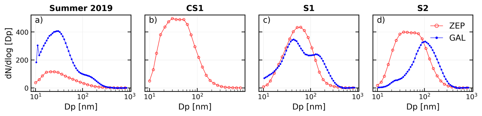 Figure 5Average particle number size distribution (PNSD) at Gruvebadet (GAL), in blue, and Zeppelin (ZEP), in red, during the summer of 2019 (June to September) (a) and events CS1 (b), S1 (c) and S2 (d). For CS1 there are only data from ZEP.