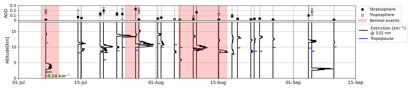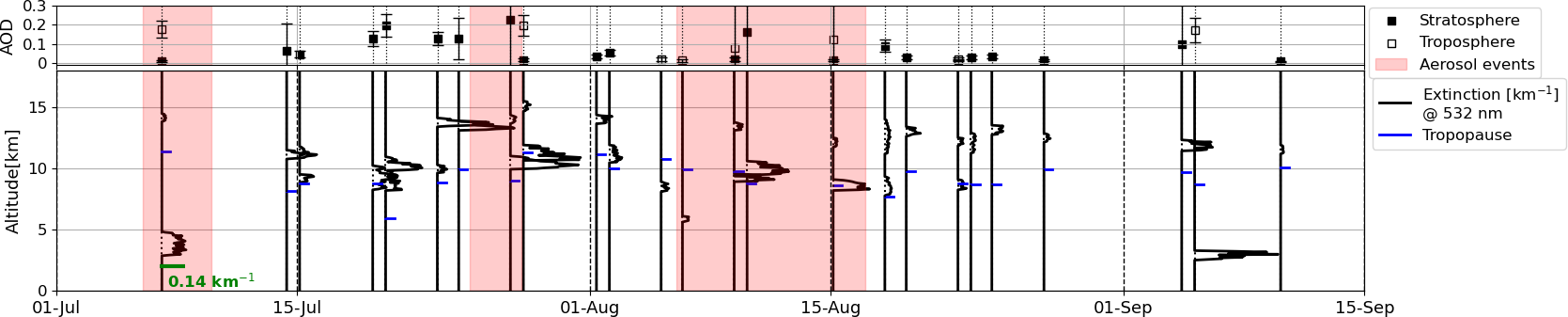 Figure 6Time series of the extinction profiles at 532 nm measured by CALIOP in the summer of 2019. For each time period where aerosol layer was identified, the enhancement of the extinction within the layer is shown; the zero line indicates the date-time of observations. For reference, an x-scale for the extinction profiles has been included in green in the first profile. The blue lines indicate the tropopause. The tropospheric and stratospheric AOD at 532 corresponding to each profile is included in the upper panel; the corresponding uncertainty of the AOD is given by the bars. The red shaded areas indicate the days on which the columnar events were identified (CS1, C2 and C3).