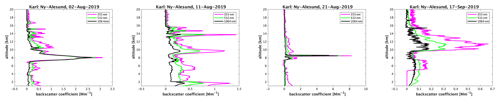 The aerosol backscatter profiles at the three available wavelengths have been calculated with 60 m and 600 s resolution according to Klett (Speidel and Vogelmann2023) with clear sky approximation (aerosol backscatter small against molecular backscatter at altitudes >22 km) and the choice of a prescribed lidar ratio (Ritter and Münkel2021) of 70, 45 and 45 sr for the wavelengths of 355, 532 and 1064 nm, respectively. The lidar ratios for 355 and 532 nm have been verified by backscatter values in the clear troposphere. An uncertainty of ±10 sr for the lidar ratio has been estimated, giving rise to about 10 % uncertainty in the derived aerosol backscatter. For the 1064 nm wavelength the uncertainty is dominated by the assumed backscatter >22 km as a boundary condition, such that also 10 % uncertainty at this wavelength is realistic. Data points in time and altitude which were covered by clouds have been removed to not bias aerosol properties.