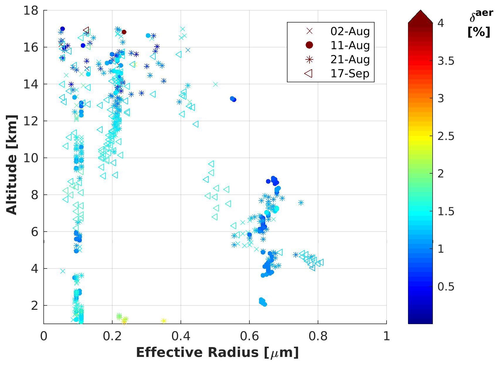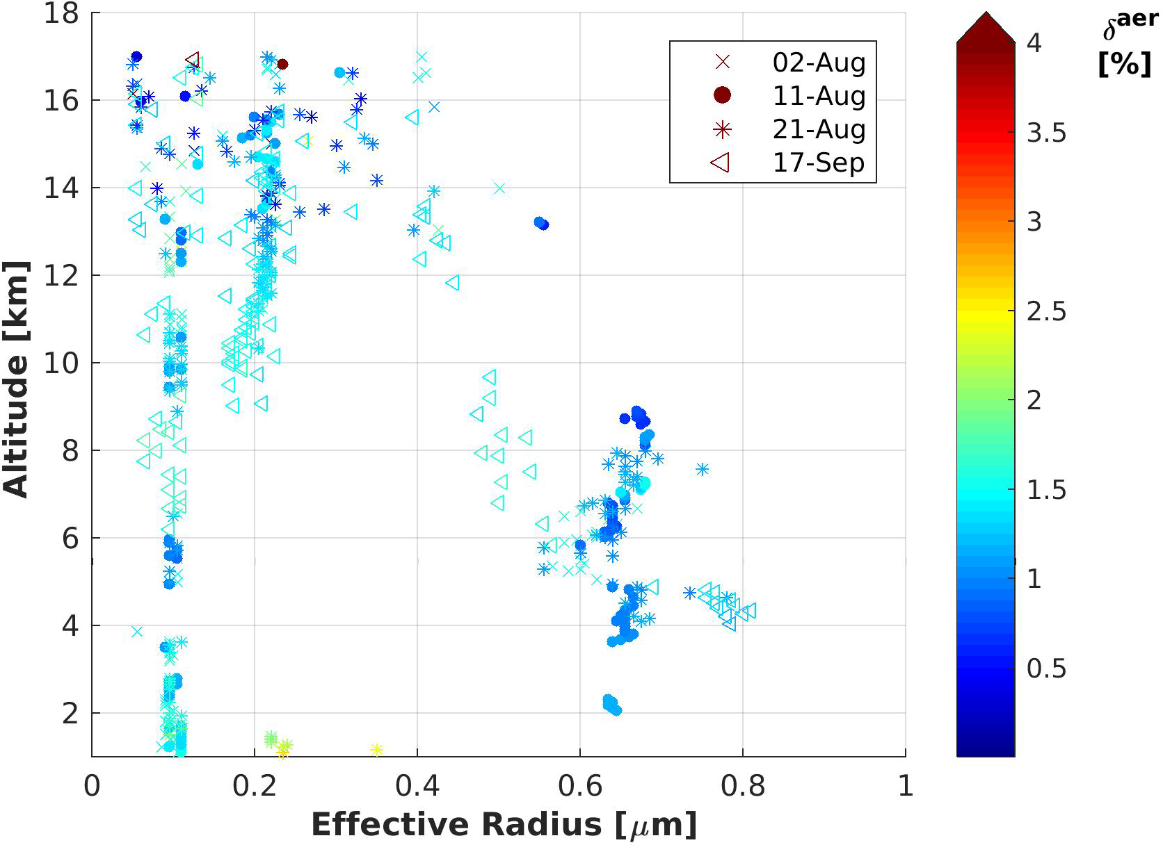 Figure 8Averaged height-dependent estimation of the effective radius determined for during Lidar observations until 18 km altitude in correlation with the aerosol depolarization, δaer, for all four observation days with KARL.