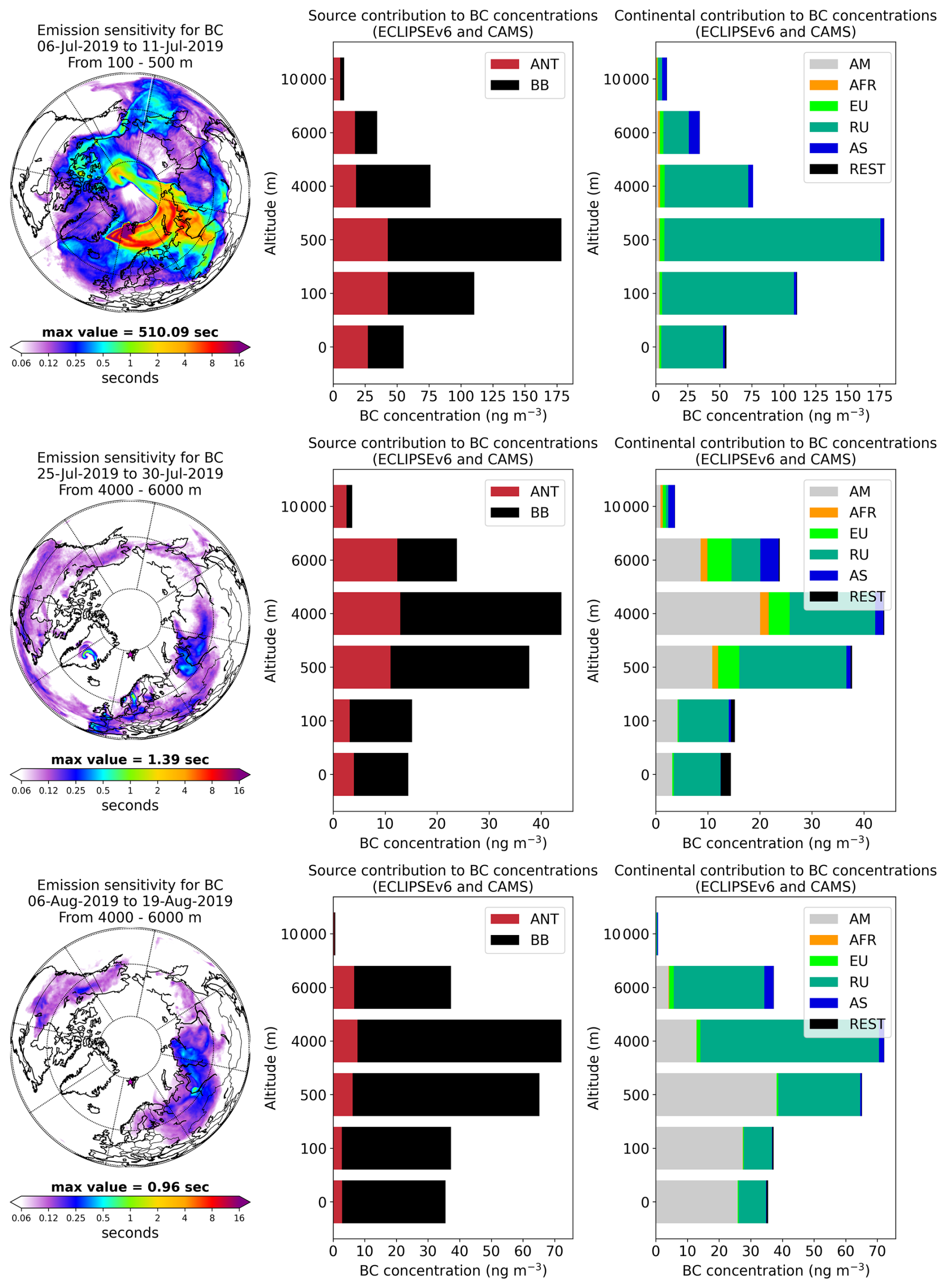 FLEXPART simulations have been performed every 3 h during the studied period. The FLEXPART output consists of a footprint emission sensitivity, which results in a modelled concentration at the receptor (Zeppelin Observatory), when coupled with gridded emissions from an emission inventory (like the ones described before). The emission sensitivity expresses the probability of any release occurring in each grid-cell to reach the receptor. The modelled concentrations can be displayed as a function of the time elapsed since the emission has occurred (i.e., “age”), which can be shown as an “age spectrum”. Detailed source contribution maps have been calculated, showing which regions contributed to the simulated concentration.