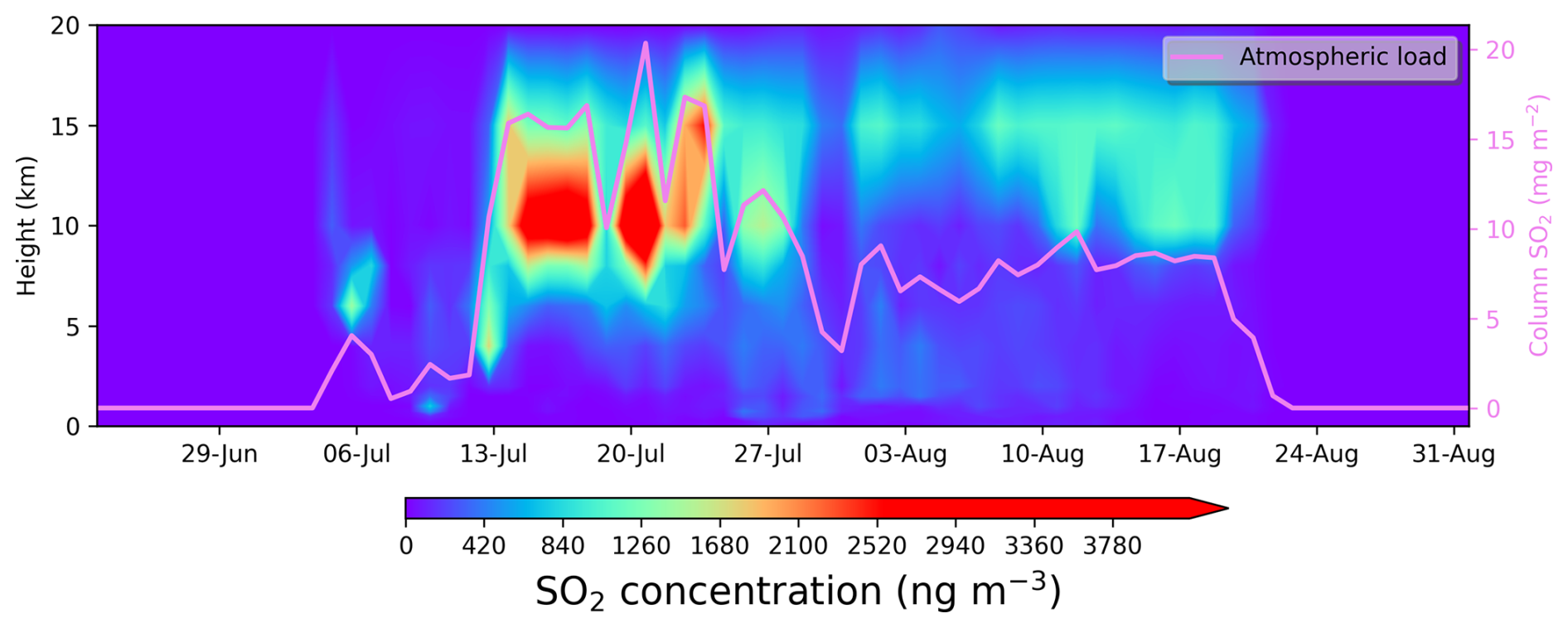 A time series with the CALIOP aerosol extinction profiles (at 532 nm) available in summer 2019 is shown in Fig. 6. The equivalent Fig. S3 in the Supplement indicates the classification of the layer aerosol type. The tropospheric and stratospheric AODs retrieved from CALIPSO for each profile are also included in the upper panel. For event CS1 a strong extinction is observed between 3 and 5 km a.g.l. Starting from 15 July a stratospheric aerosol layer at about 12 km a.g.l. is observed, with the corresponding increase in the stratospheric AOD. An aerosol layer between 10 and 15 km a.g.l. is also observed in the following extinction profiles, with variable intensity. During C2 and C3, no clear signature of aerosols is observed in the troposphere, maybe related to the presence of tropospheric clouds, which would mask the aerosol when observing from a satellite.