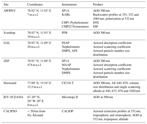 The sun-photometer dataset used in this study from Hansen et al. (2022) includes the AOD at several wavelengths (depending on the instrument) and the AE derived in the range 380–870 nm. The comparability of the AOD from the different sun-photometers was already assessed within the mentioned projects. For this analysis, hourly and instantaneous values of AOD at 500 nm and AE in the 380 and 870 nm range have been used. In addition, particle volume size distribution (PVSD) and single scattering albedo (SSA) have been directly obtained from the AERONET website (https://aeronet.gsfc.nasa.gov/, last accessed: 12 January 2026). All AERONET data used correspond to level 1.5 products (version 3). These retrieved properties have been filtered by the residual obtained by the inversion algorithm; inversions with residuals bigger than 10 % have been rejected, which ensures the quality of the retrievals. For the period of study the PVSD and SSA are only available at Hornsund.