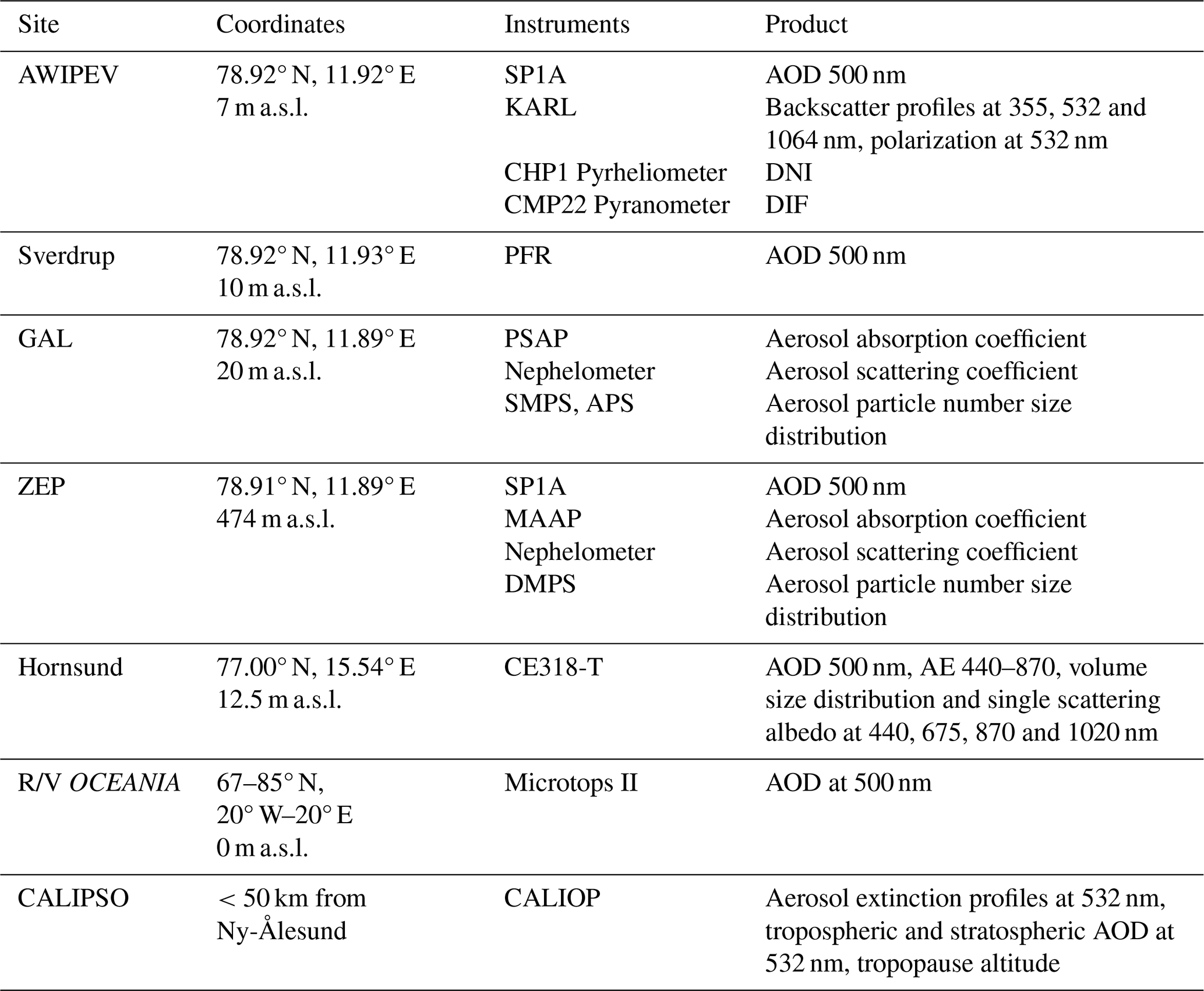 Table 1Summary of sites, instrumentation and data products. Data products include aerosol optical depth (AOD), Backscatter profiles, direct normal irradiance (DIR), diffuse solar irradiance (DIF), aerosol absorption and scattering coefficients, aerosol particle number size distribution and aerosol extinction profiles.