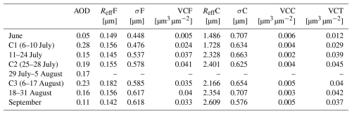 Table 2Mean values of the aerosol optical depth (AOD) and the parameters of the PVSD: effective radius (Reff), standard deviation (σ), and volume concentrations (VC), for fine (F) and coarse (C) modes, and the total volume concentration (VCT), during the different periods identified with aerosol event, and adjacent periods during summer 2019 (June to September). Products extracted from AERONET.