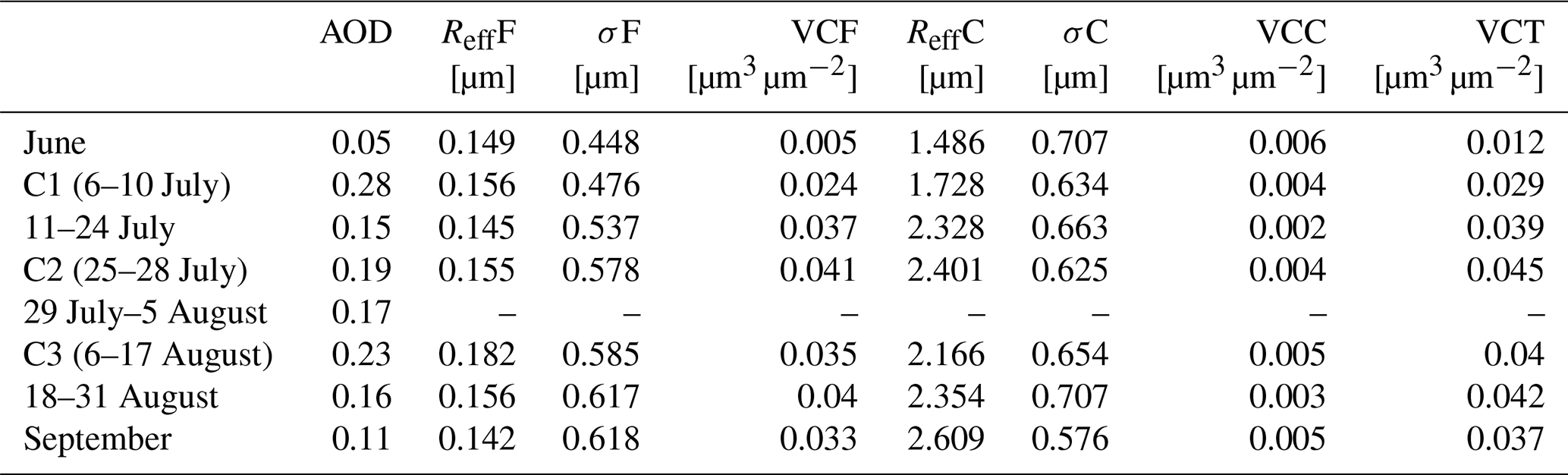 In September only two inversions are available (on the 5th). These presented a ReffF〉 of 0.142 µm and, again, a similar shape, but with a lower concentration at each radius than the ones observed in event C2 (July). However, the coarse mode seems slightly enhanced and these particles, larger than 2 µm, should sediment down quickly. As similar observations are made throughout July, August and September, this might indicate a steady supply of new aerosol (because of the life-time of these coarse particles). Alternatively, due to the low concentration of the coarse mode, it could just indicate the presence of a steady stratospheric aerosol starting from event C2, which was combined with new aerosol with the arrival of new aerosol events. Therefore it can be hypothesized that we are facing a combination of different aerosol sources.