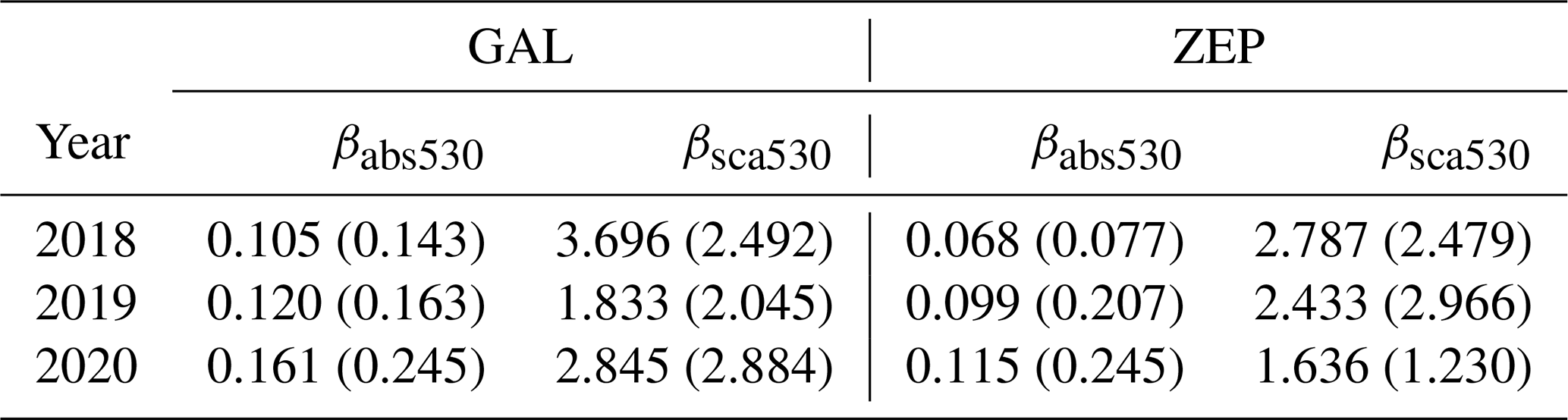 Table 3Seasonal averages (and standard deviation in parentheses) for summers (June to September) 2018, 2019 and 2020 for aerosol absorption (βabs) and the scattering (βsca) coefficients at 530 nm.