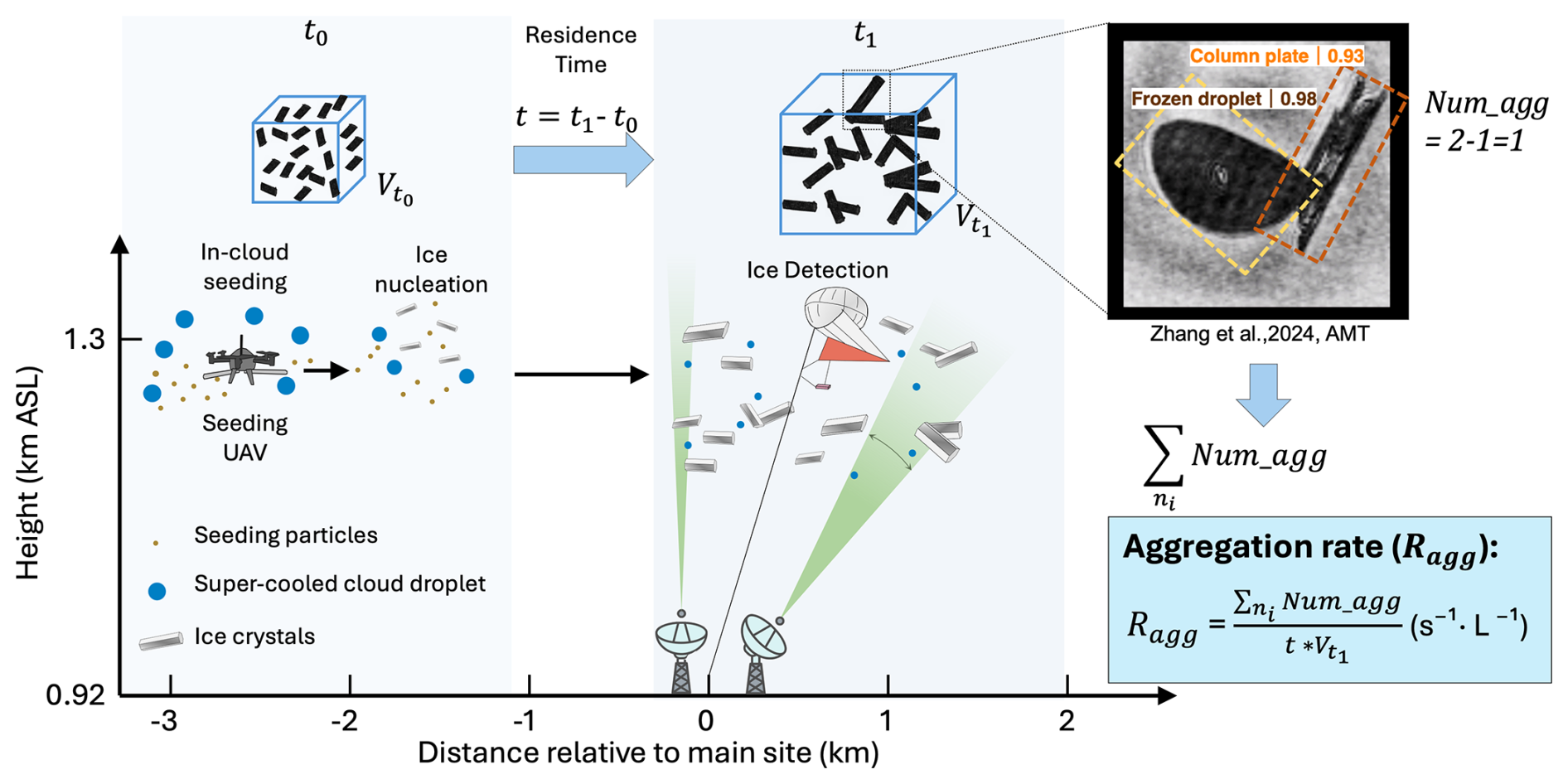 Figure 1Scheme for quantifying in situ ice aggregation after cloud seeding. Seeding particles are released by a UAV, initiating ice crystal formation at time t0. The ice crystals grow and aggregate during the advection time t1t0, and at t1 an image of them is captured by a holographic imager on a tethered balloon system. The ice habit and the number of monomers per aggregate are quantified based on the IceDetectNet (Zhang et al.2024). For example, the right panel shows an aggregate consisting of two monomers classified as a frozen droplets and a column-plate. The aggregation rate (Ragg) is defined as the total number of aggregation events, (ni-1), divided by the advection time t and the sampled volume Vt1 at t1.