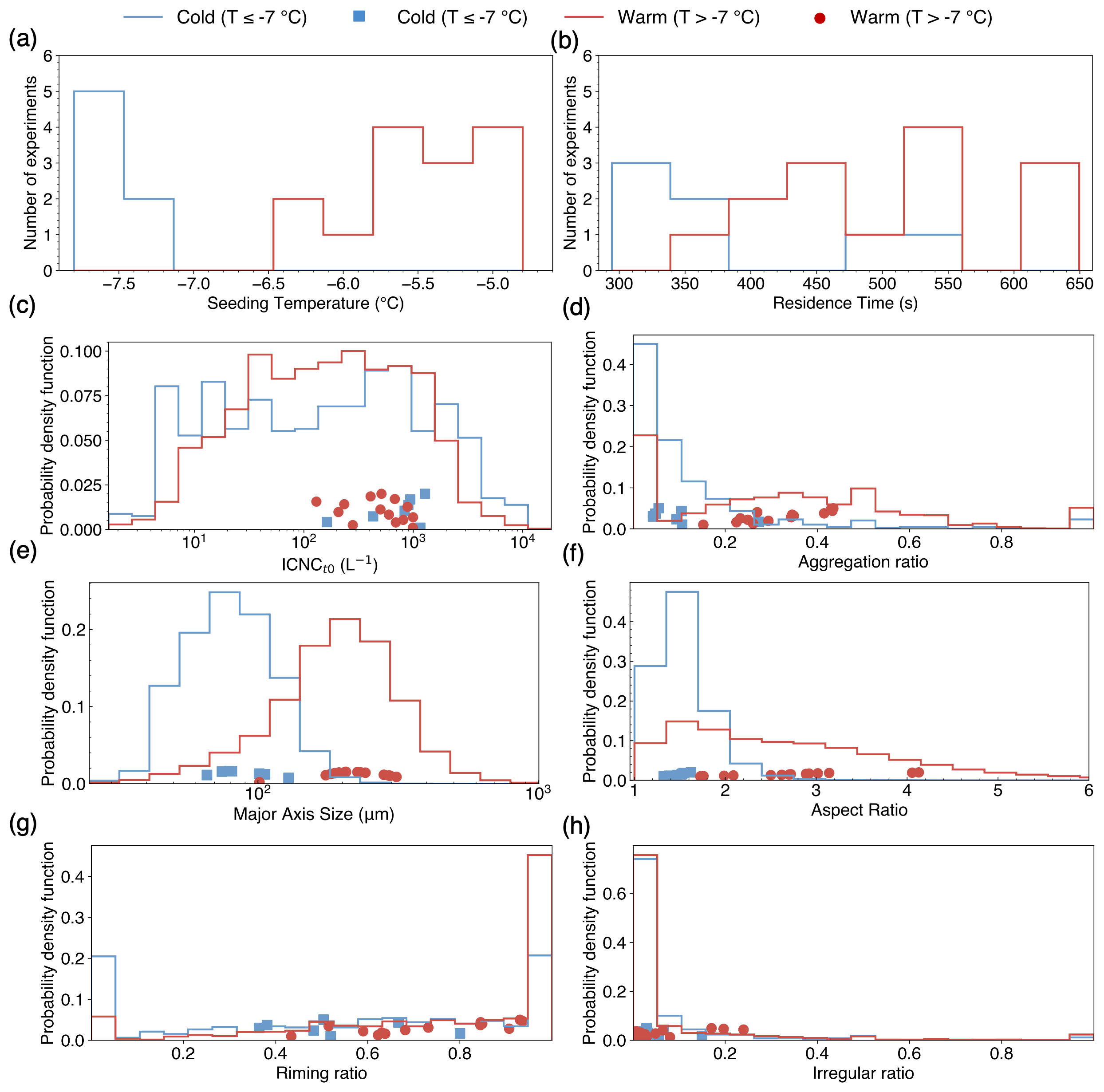 Figure 2Distributions of ice crystal properties during seeded periods, grouped by temperature: colder (T7 °C, blue) and warmer (T>7 °C, red). (a) Temperature; (b) Advection time; (c) ICNCt0; (d) Aggregation ratio; (e) Major size of ice crystals; (f) Aspect ratio; (g) Riming ratio; (h) Irregular ratio. For (a) and (b), the solid lines show the per-experiment distributions. For (c) through (h), the solid lines represent one-second resolution distributions within each regime, and the scatter points indicate the means of the experiments (The scatter positions along the y axis are offset solely to reduce overlap. Only the values along the x axis carry meaning).