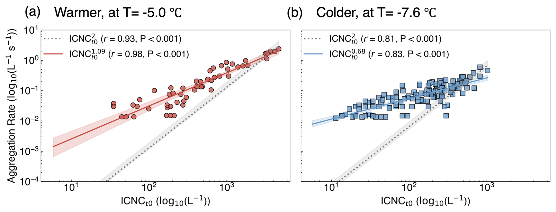 Figure 3Correlation between aggregation rate and ICNCt0 in two temperature regimes. (a) warmer case (SM054, T=5.0 °C); (b) colder case (SM069, T=7.6 °C). One-second data points are shown as red circles (warmer) and blue squares (colder). Solid lines with shaded areas show free power-law fits Ragg=aICNCt0n with 95 % confidence intervals (red for warmer, blue for colder); dashed lines with grey shading show quadratic fits (n=2). The prefactor a was fitted independently for each experiment and reflects the effective collision kernel.