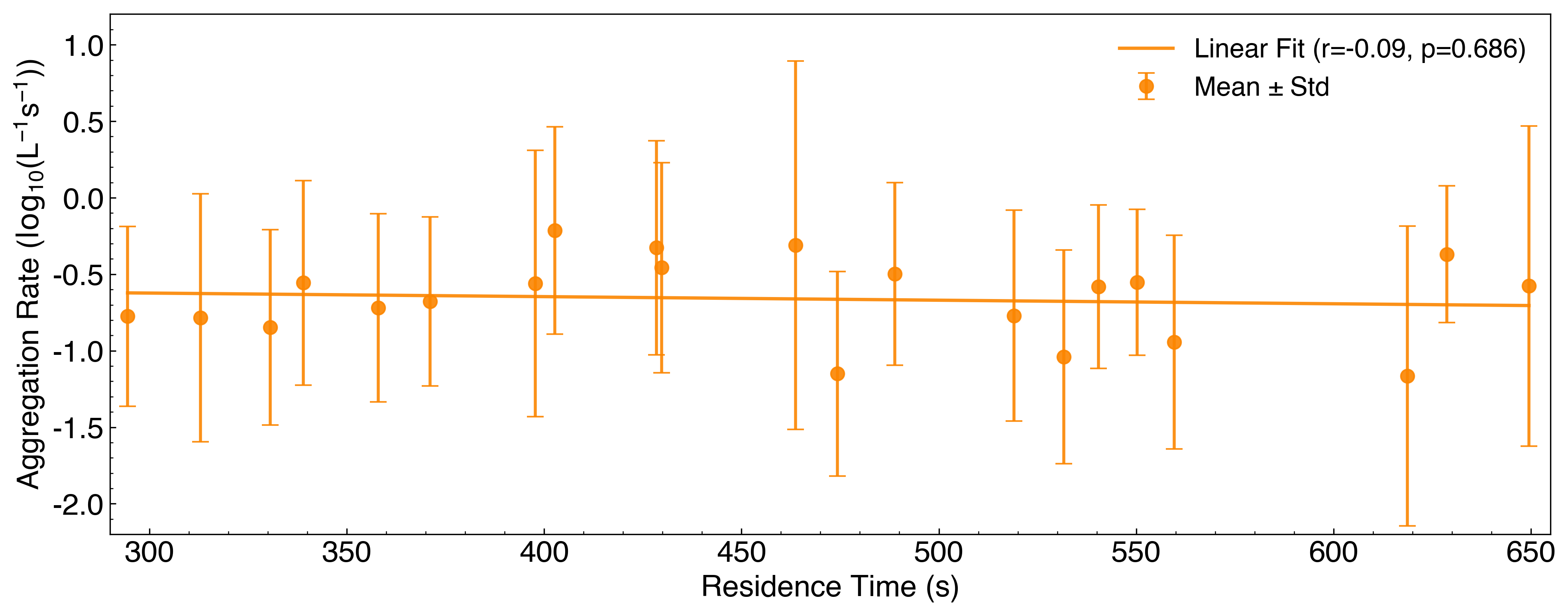 Figure 4Correlation between aggregation rate and advection time. Orange markers with error bars show the mean ± standard deviation for each experiment, and the solid line represents the linear fit (r=0, p=0) across all 21 experiments.