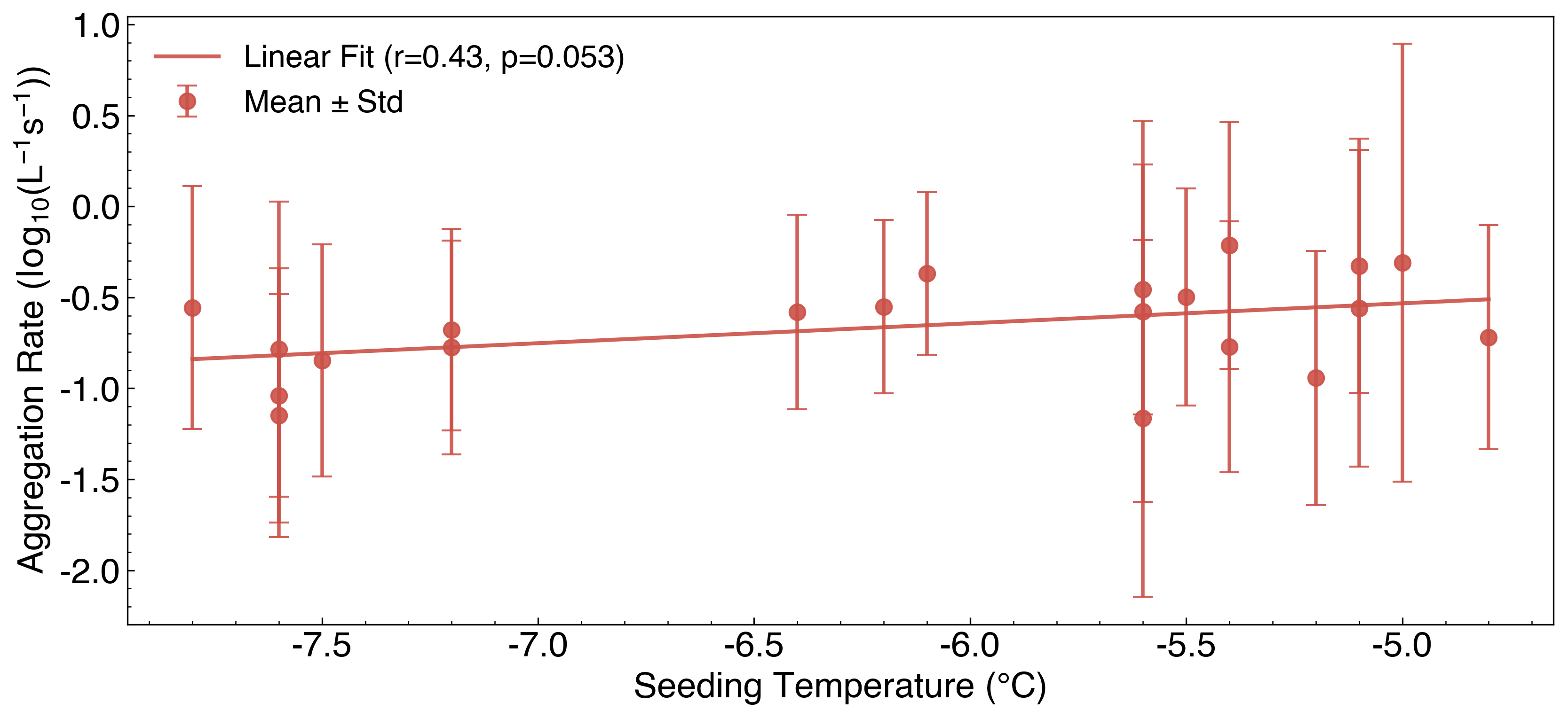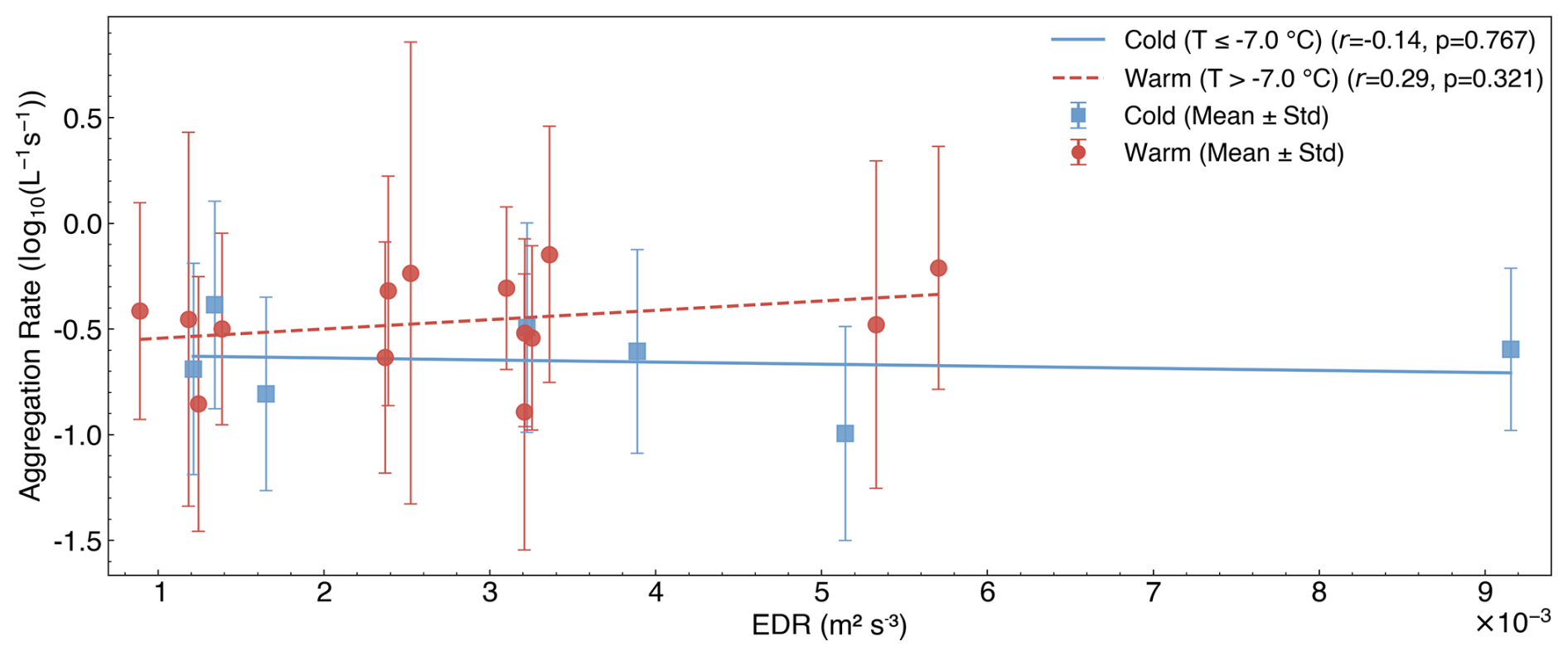 Consistent with this interpretation, aggregation rate shows a very weak positive association with temperature across all experiments (Pearson r=0, p=0; Fig. 5). While this relationship does not reach conventional significance levels and may therefore be difficult to distinguish from noise over the limited temperature range sampled, it is qualitatively consistent with the observed structural differences in the ice population and with previous laboratory studies suggesting enhanced aggregation under warmer conditions (Hosler et al.1957).