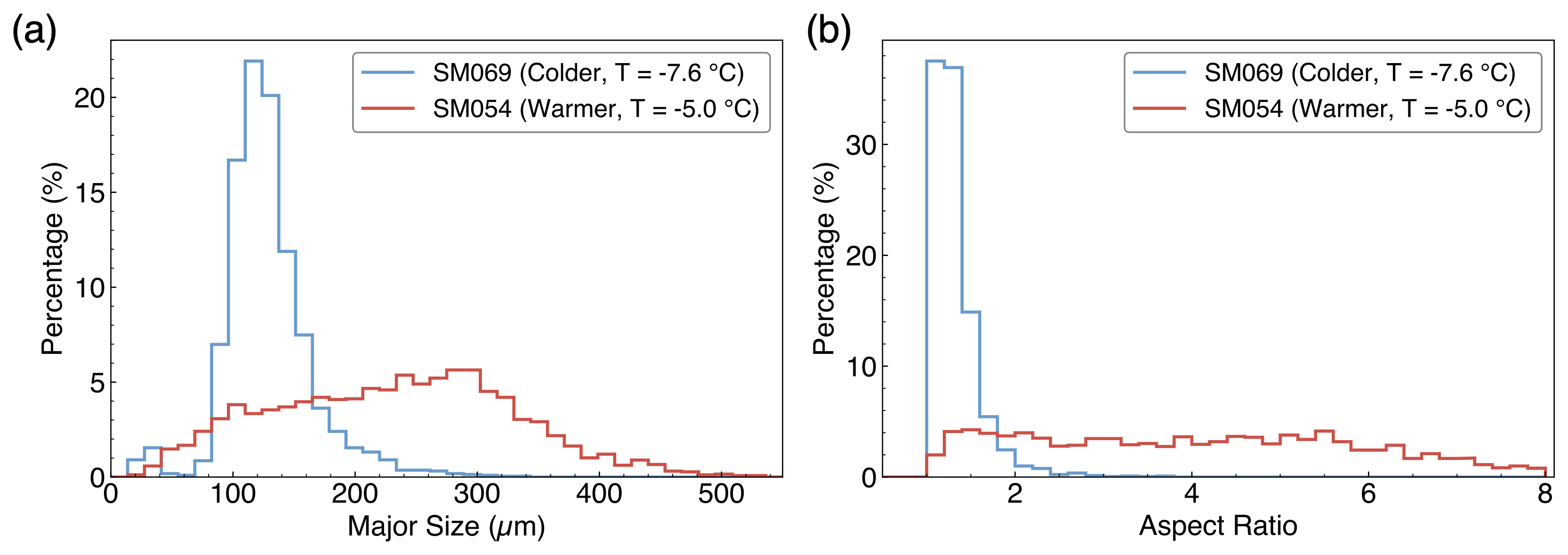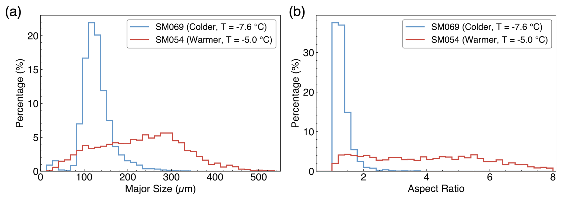 Figure 6Distributions of ice crystal major axis length and aspect ratio in warmer and colder cases. (a) Major axis length and (b) aspect ratio for SM054 (warmer, red) and SM069 (colder, blue).