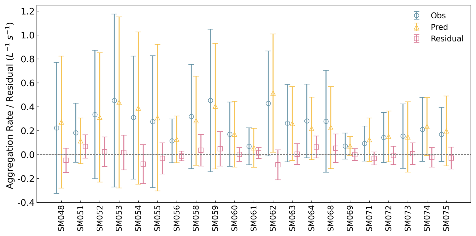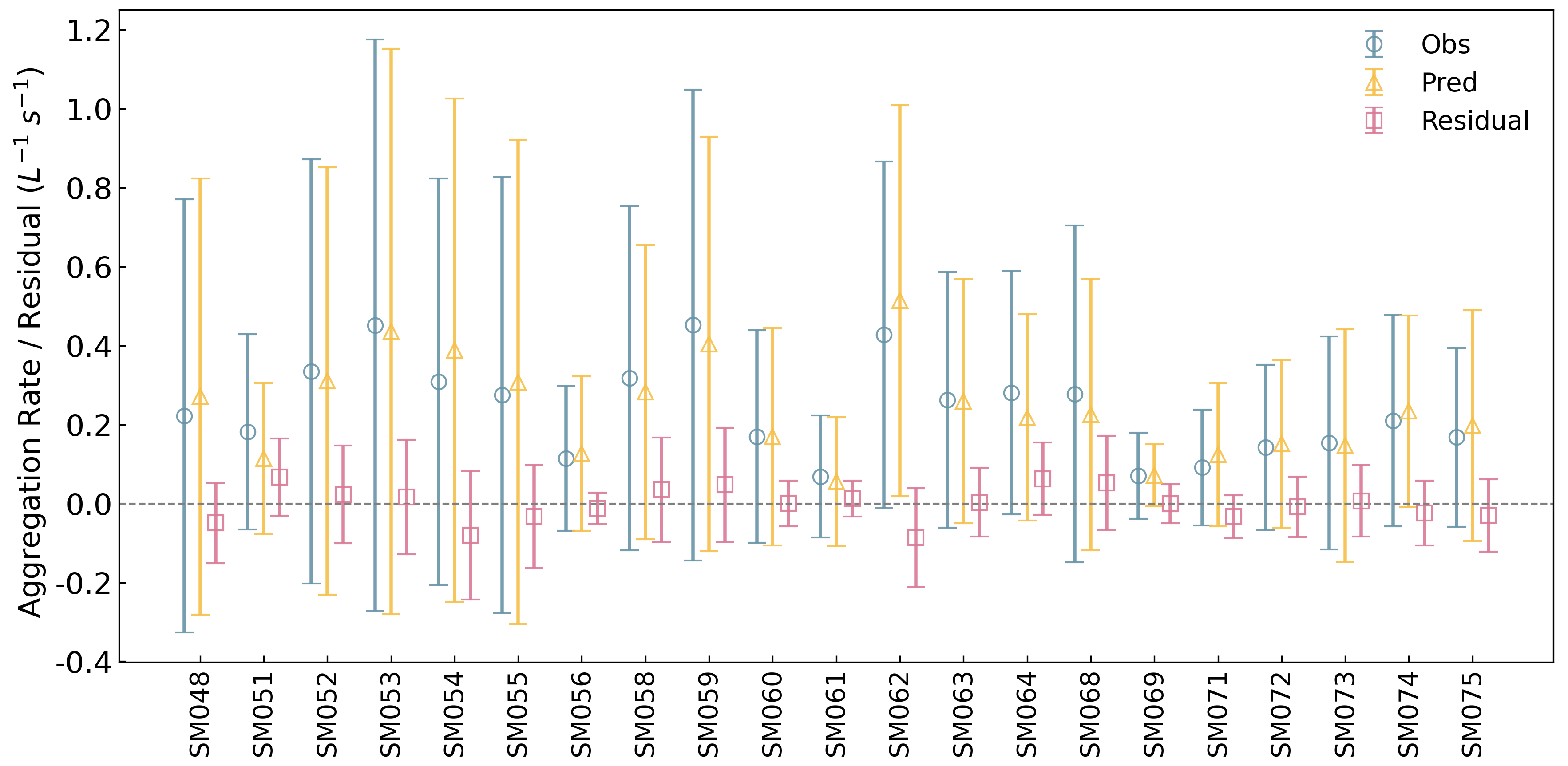 Figure 8Observed, predicted, and residual aggregation rates per experiment. For each experiment, observed aggregation rates (dark blue circles), CatBoost-predicted aggregation rates (yellow triangles), and residuals (pink squares, observed minus predicted) are shown side by side, with observed values on the left, predicted in the middle and residuals on the right. Markers indicate mean values, and error bars represent the standard deviation within each experiment. Rates are expressed in L−1 s−1.