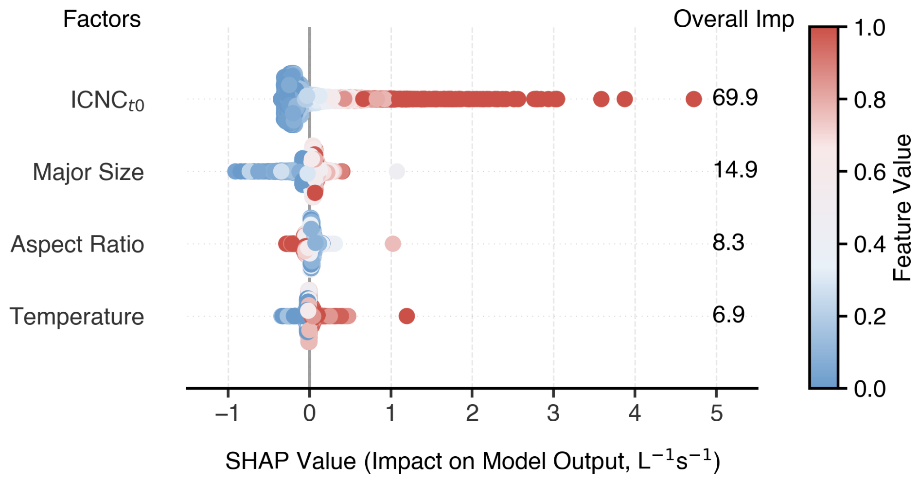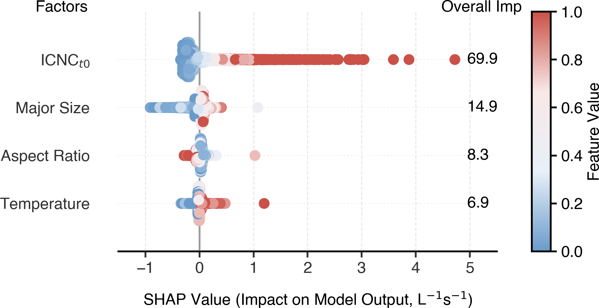 Figure 9SHAP analysis of feature contributions to CatBoost model predictions. Each dot represents one prediction at 1 s resolution from the test data. SHAP values (horizontal axis) indicate the impact of each input feature on the predicted aggregation rate. Features (i.e. ICNCt0, Major size, Aspect ratio, and Temperature) are ranked by their overall importance (right), with percentages representing the mean absolute SHAP value normalized across all features. Dot colors reflect the corresponding feature values, with red denoting higher and blue denoting lower values of the feature.