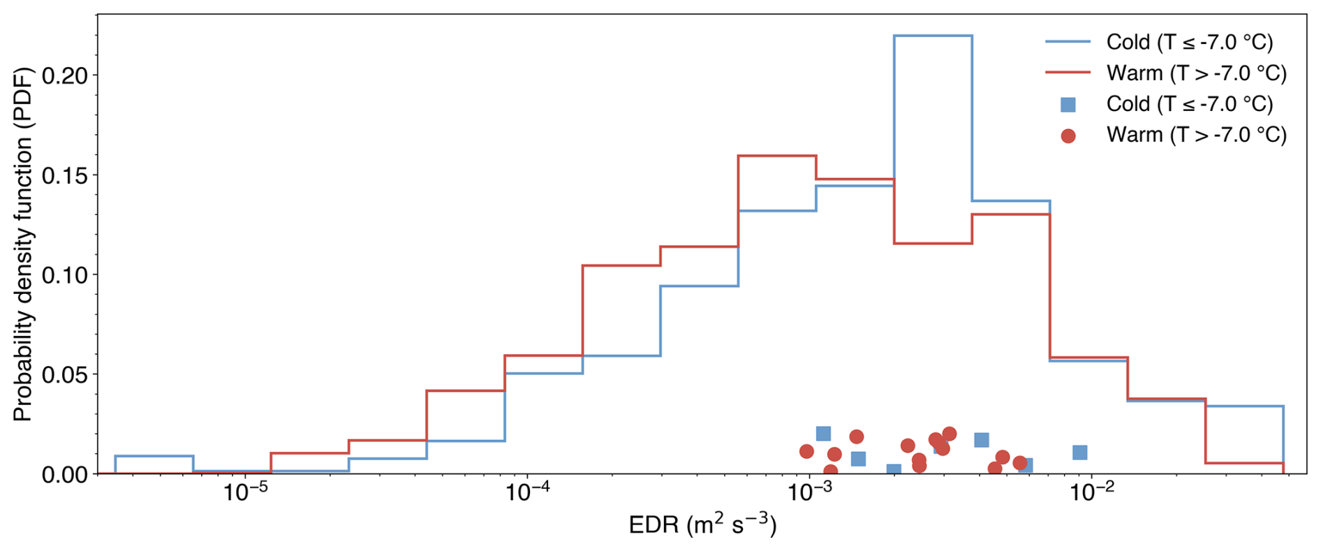 Figure B2Distribution of EDR grouped by temperature group. Top: Probability density functions of EDR for all seeding experiments, grouped by temperature: colder (T7 °C, blue) and warmer (T>7 °C, red). Bottom: Mean EDR values for individual experiments, shown as red circles (warmer) and blue squares (colder).