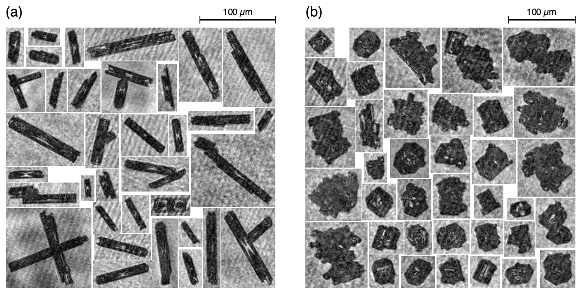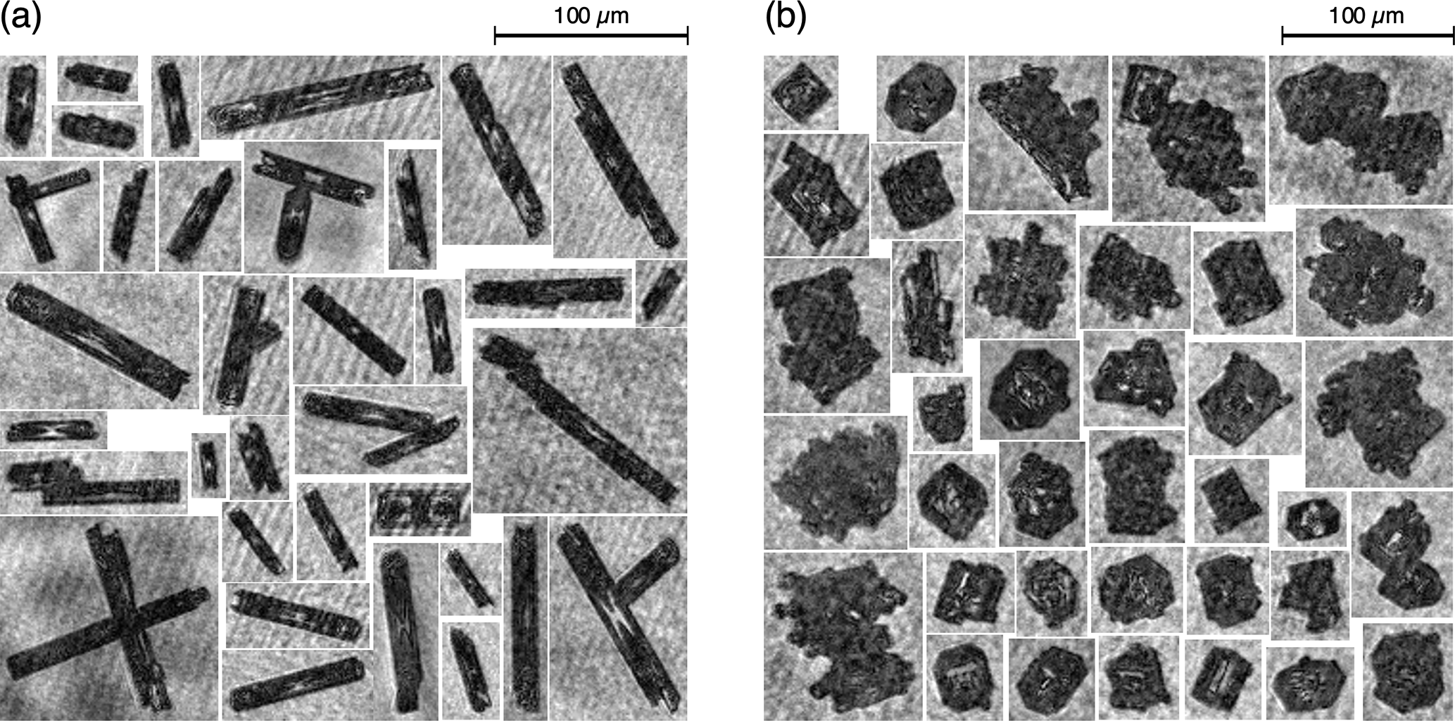 Figure E1A randomly selected sample of ice crystal images observed by HOLIMO during (a) SM054 and (b) SM069.
