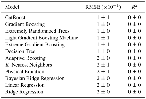 Building on the preceding analysis, we next evaluated whether aggregation rates can be quantitatively predicted from the identified microphysical and meteorological factors. We first describe the training procedures and evaluation metrics (Sect. 4.1). Then, we implemented and compared eleven machine learning models (Sect. 4.2) and one physically based equation (Sect. 4.3), using temperature, major axis length, aspect ratio, and ICNCt0 as input features and the aggregation rate as the target variable. RR was excluded from the predictive modeling as its direct effect on aggregation was found to be negligible in our causal inference analysis (Sect.3.2). Finally, to evaluate the robustness of these models under varying atmospheric and microphysical conditions, we performed a sensitivity analysis with respect to temperature and ICNCt0 (Sect. 4.4).