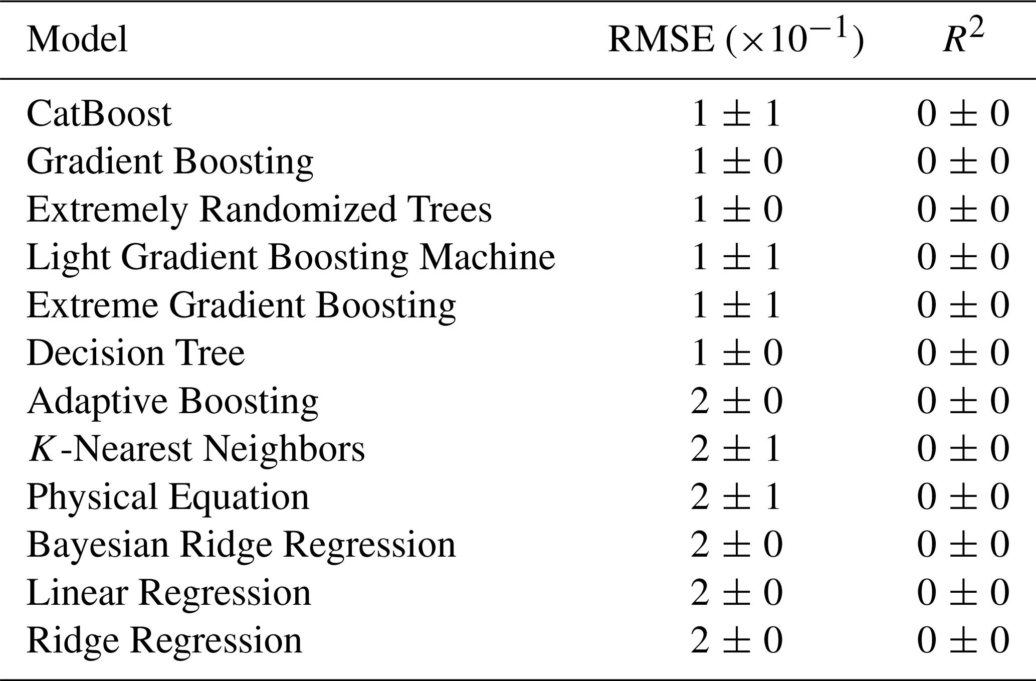 We implemented eleven supervised regression algorithms to model the relationship between environmental and microphysical predictors and aggregation rate. These included linear methods (Linear, Ridge, and Bayesian Ridge Regression), instance-based learning (K-Nearest Neighbors), decision tree–based models (Decision Tree, Extremely Randomized Trees), and ensemble boosting techniques (Adaptive Boosting, Gradient Boosting, Light Gradient Boosting Machine, Extreme Gradient Boosting, and gradient boosting with categorical features support (CatBoost)). Linear models assume independent, additive effects and are limited in representing nonlinear interactions. Tree-based models capture nonlinear and interaction effects through hierarchical partitioning of the feature space, while boosting methods iteratively refine predictions by combining multiple weak learners. Detailed descriptions of all models are provided in Appendix C. Among these, CatBoost is particularly well-suited for the current problem because of its ability to handle nonlinear interactions and its robustness to overfitting. CatBoost is a gradient boosting method that uses symmetric (oblivious) decision trees, where all nodes at the same depth split on the same feature and threshold. This symmetry simplifies optimization and improves generalization. It also introduces “ordered boosting,” which builds trees in a way that avoids using future information during training, thereby reducing overfitting. Additionally, CatBoost efficiently handles categorical features and typically requires minimal hyperparameter tuning.