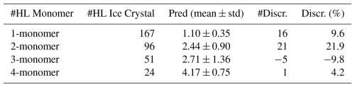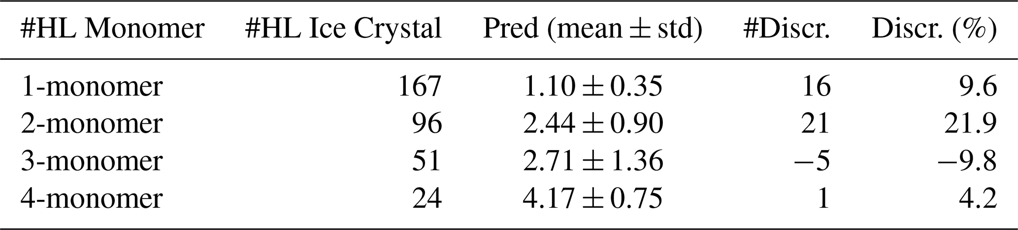 4. Complete detection of aggregate monomers. All monomers within an aggregate are assumed to be accurately identified by IceDetectNet. However, some early aggregates may become unresolved after diffusional growth and be classified as irregular, but this fraction is very small (see Fig. 2h). Other potential detection errors and classification errors are discussed in Appendix A and are considered negligible.