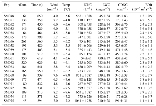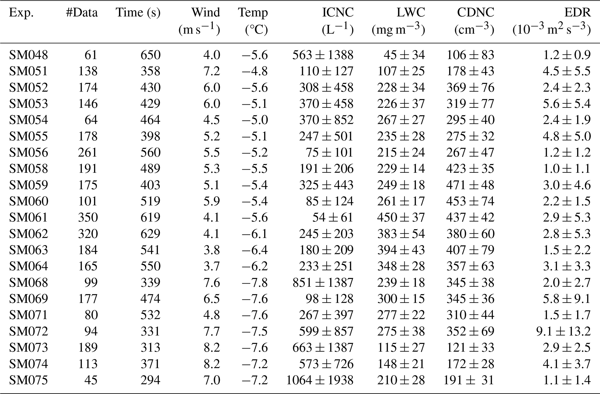 Table F1Summary of all seeding experiments. For each experiment (Exp.) (where “SM” denotes seeding mission, consistent with Fuchs et al.2025; Miller et al.2025), the table lists the number of 1 s data points (#Data), advection time between seeding and sampling (Time, in s), wind speed at seeding level (Wind, in m s−1), temperature (Temp, in (°C)), mean ice crystal number concentration (ICNC, in cm−3), background liquid water content (LWC, in mg m−3), cloud droplet number concentration (CDNC, in cm−3), and mean eddy dissipation rate (EDR, in 10−3 m2 s−3). ICNC, LWC, CDNC, and EDR reported values are means ± standard deviations.