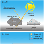 Several typical individual PS cases have been used to investigate dust aerosol effects. Based on multi-platform observations, Min et al. (2009) and Li and Min (2010) investigated the impact of dust aerosols on a well-developed mesoscale convective system (MCS) occurred in the tropical eastern Atlantic and found that more small-sized cloud particles and precipitating hydrometeors formed in the dust-laden cloud system. The dust-induced microphysical effect is more evident for stratiform precipitation, where the rain rate at higher altitudes is enhanced. The simulation of the same MCS case (Gibbons et al., 2018) indicated that increasing the IN concentration in dust scenarios results in the formation of more numerous small ice particles in the heterogeneous nucleation regime (between −38 and −5 °C) than in the clean case. Depositional growth and riming of these particles release more latent heat, which in turn invigorates convective updrafts. However, the particle growth rates decrease due to the increased competition between individual particles for limited water vapor during diffusional growth, as well as available small drops or crystals during collection processes. Chen et al. (2019) investigated the effects of dust particles acting as CCN and IN on the growth of hail in convective clouds through a storm case simulation. The results showed that increasing CCN concentration led to larger supercooled liquid water content and larger size of hail particles, while more IN caused a decrease in the size of graupel and suppressed the growth of hailstones. Although these case studies have demonstrated the possible impacts of dust aerosols on PS to some extent, it is still unclear how the 3-D structure of PS responds to changes in dust loading, especially from a statistical perspective.