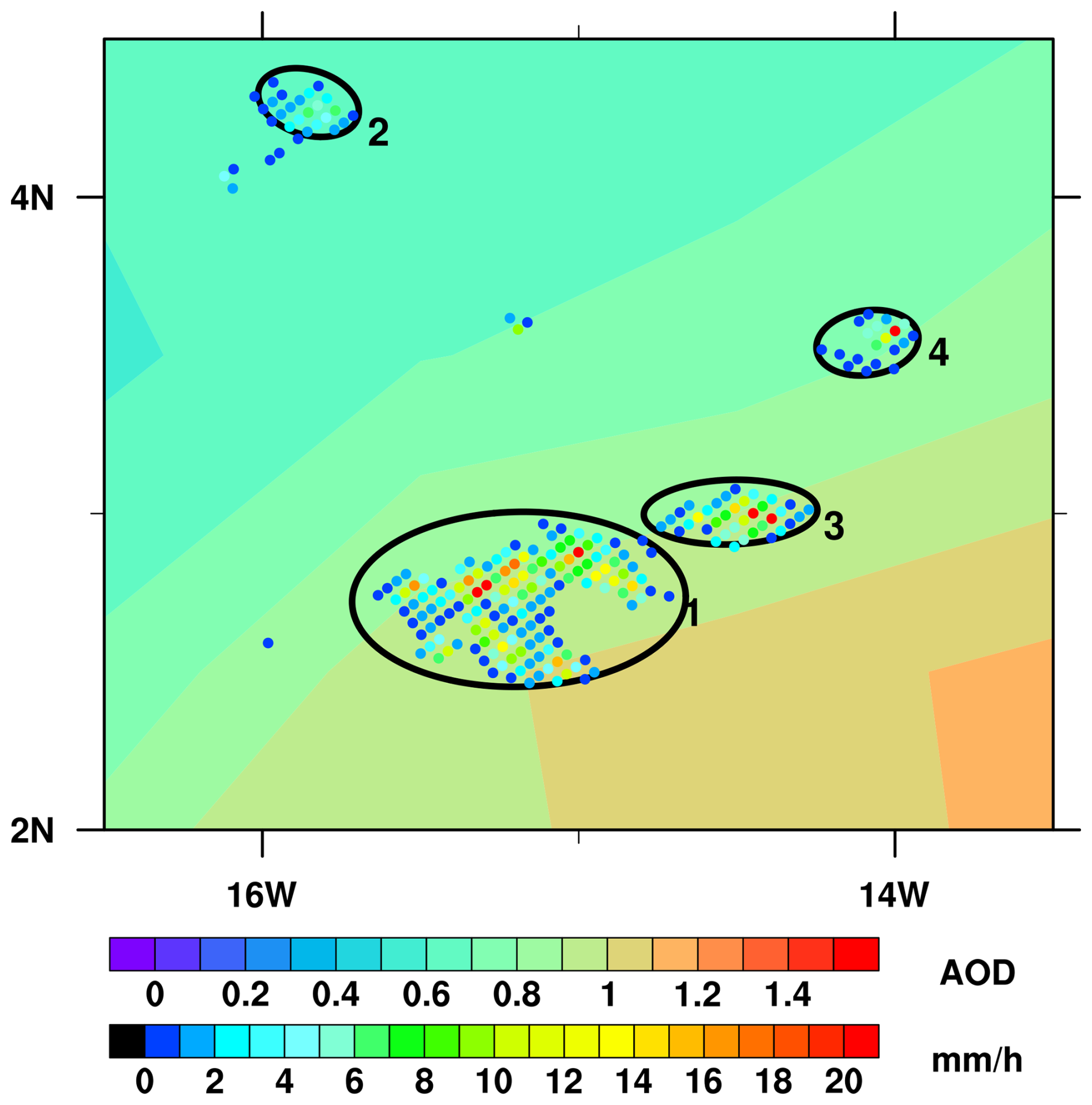 Figure 1Near-surface rain rates of several PSs idealized as ellipses over the tropical Atlantic Ocean on 27 February 2008 measured by PR (orbit number: 58594). The shaded map is the spatial distribution of MODIS AOD. The four PSs are numbered and represented by black elliptical outlines.