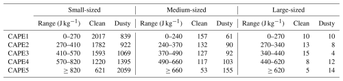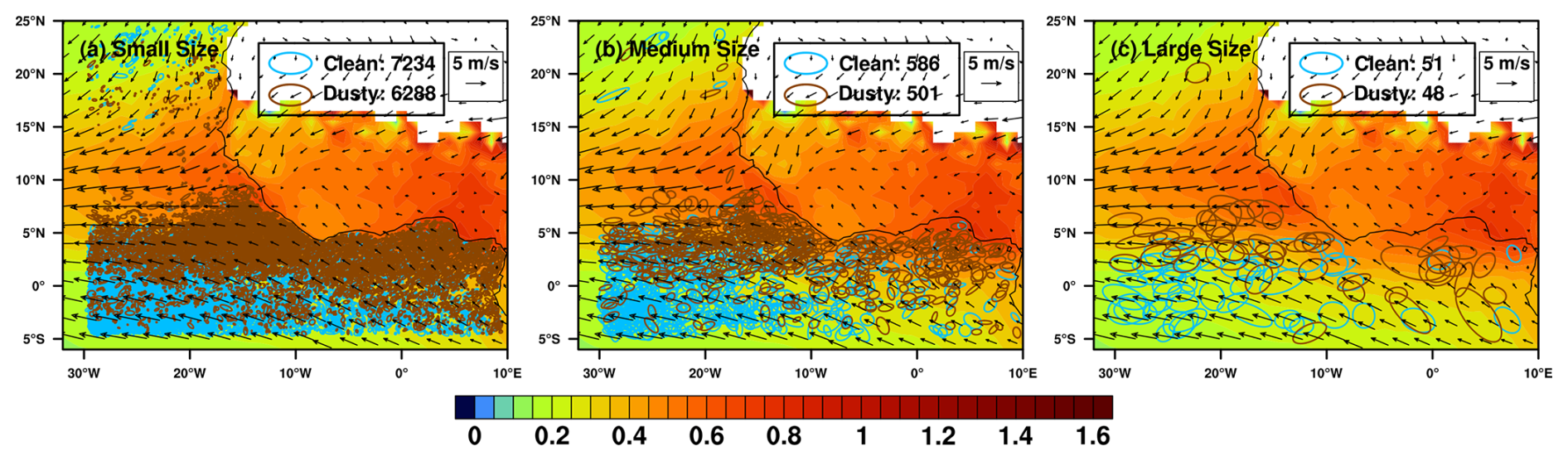 Figure 2 shows the spatial distributions of all dust-free and dust-laden PSs of different sizes during spring from 2003 to 2014. Obviously, small-sized PSs have the largest number of samples, while large-sized ones have the smallest. Most of the PSs are located in the ITCZ, where the convergence of warm and moist trade winds brings updrafts favoring the development of convection and precipitation (Schneider et al., 2014). Dust-laden PSs are closer to land than clean ones, which is consistent with the distribution of the multi-year average AOD (the shaded background in Fig. 2) due to the transport of dust aerosols from land. This suggests that the proposed method dividing PSs into clean and dusty conditions is reasonable. It should be noted that the closer the PSs are to the coastline, the stronger the thermodynamic conditions are likely to be. As a result, the influence of meteorological conditions needs to be carefully considered later in this study.