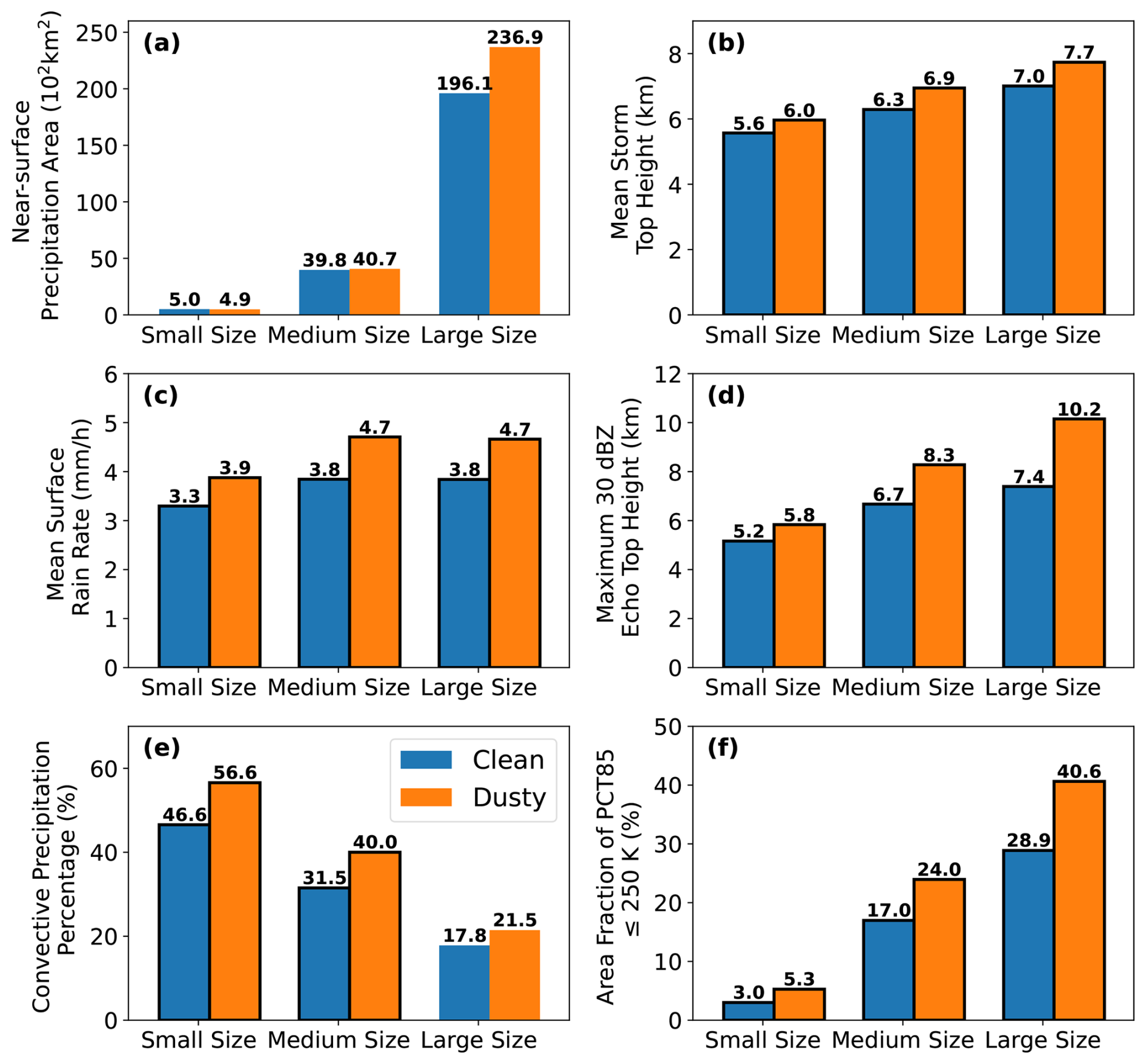 Figure 3The averages of general characteristics of PSs of different sizes, including (a) near-surface precipitation area (km2), (b) mean storm top height (km), (c) mean surface rain rate (mm h−1), (d) maximum 30 dBZ echo top height (km), (e) convective precipitation percentage (%) and (f) area fraction of PCT85 ≤ 250 K (%) under clean and dusty conditions. The average values of these properties are labeled on the data bars. The black border around the data bar indicates that the difference between clean and dusty conditions is statistically significant at the 95 % confidence level using a Student's t-test.