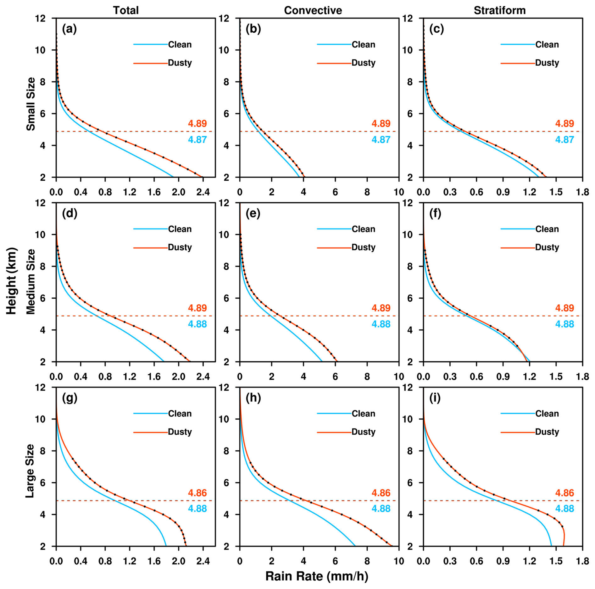 Figure 4The mean vertical profiles of median rain rates for total, convective and stratiform precipitation of small-sized (upper row), medium-sized (middle row), and large-sized (bottom row) PSs under clean and dusty conditions. The black dot on the red line indicates that the difference between clean and dusty conditions is statistically significant at the 95 % confidence level using a Student's t-test. The horizontal dashed lines show the freezing level with values labeled.