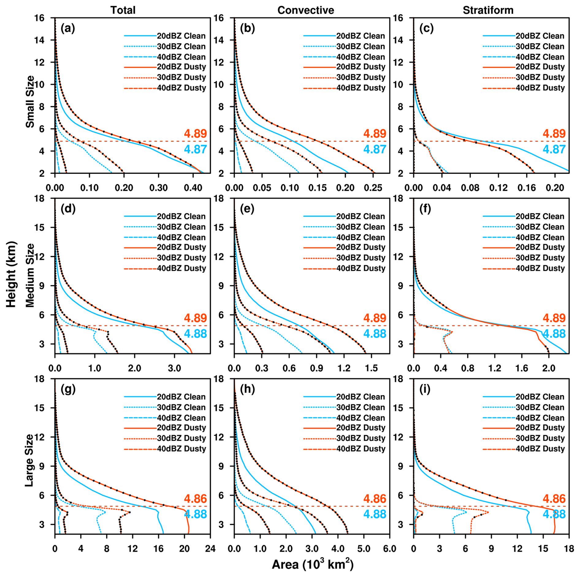 Figure 5The mean vertical profiles of 20, 30 and 40 dBZ areas for total, convective and stratiform precipitation of small-sized (upper row), medium-sized (middle row), and large-sized (bottom row) PSs under clean and dusty conditions. The black dot on the red line indicates that the difference between clean and dusty conditions is statistically significant at the 95 % confidence level using a Student's t-test. The horizontal dashed lines show the freezing level with values labeled.