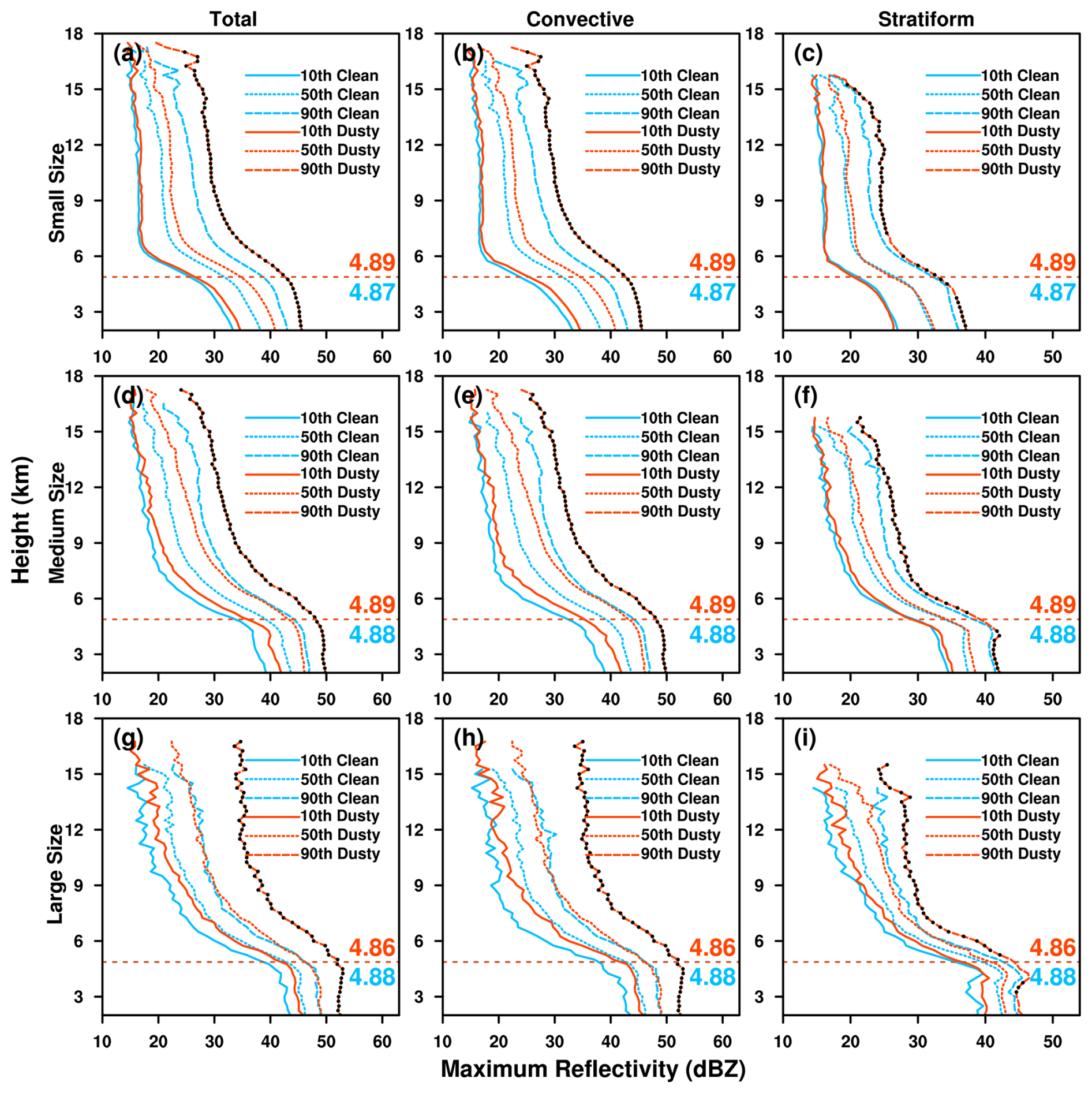 Figure 6 shows the vertical profiles of the 10th, 50th, and 90th percentiles of maximum radar reflectivities as proxies of various convective strengths (Zipser and Lutz, 1994; Xu et al., 2009). It is clearly seen that the maximum radar reflectivities at different percentiles increase at all heights in response to higher aerosol loading, regardless of PS size or precipitation type, which again suggests that dust can stimulate stronger convective activity in PSs. In addition, the difference in the 90th percentile of maximum radar reflectivity between clean and dusty conditions is greater than that for the 10th percentile. This might be explained by the fact that stronger updrafts within a well-developed PS can lift dust particles to higher altitudes more easily, and allow more smaller ice particles produced by dust IN effect to grow to larger size. Similar enhancement in convective precipitation with increasing dust aerosols have also been found in previous modeling and observational studies (van den Heever et al., 2006; Zhang et al., 2020, 2021).