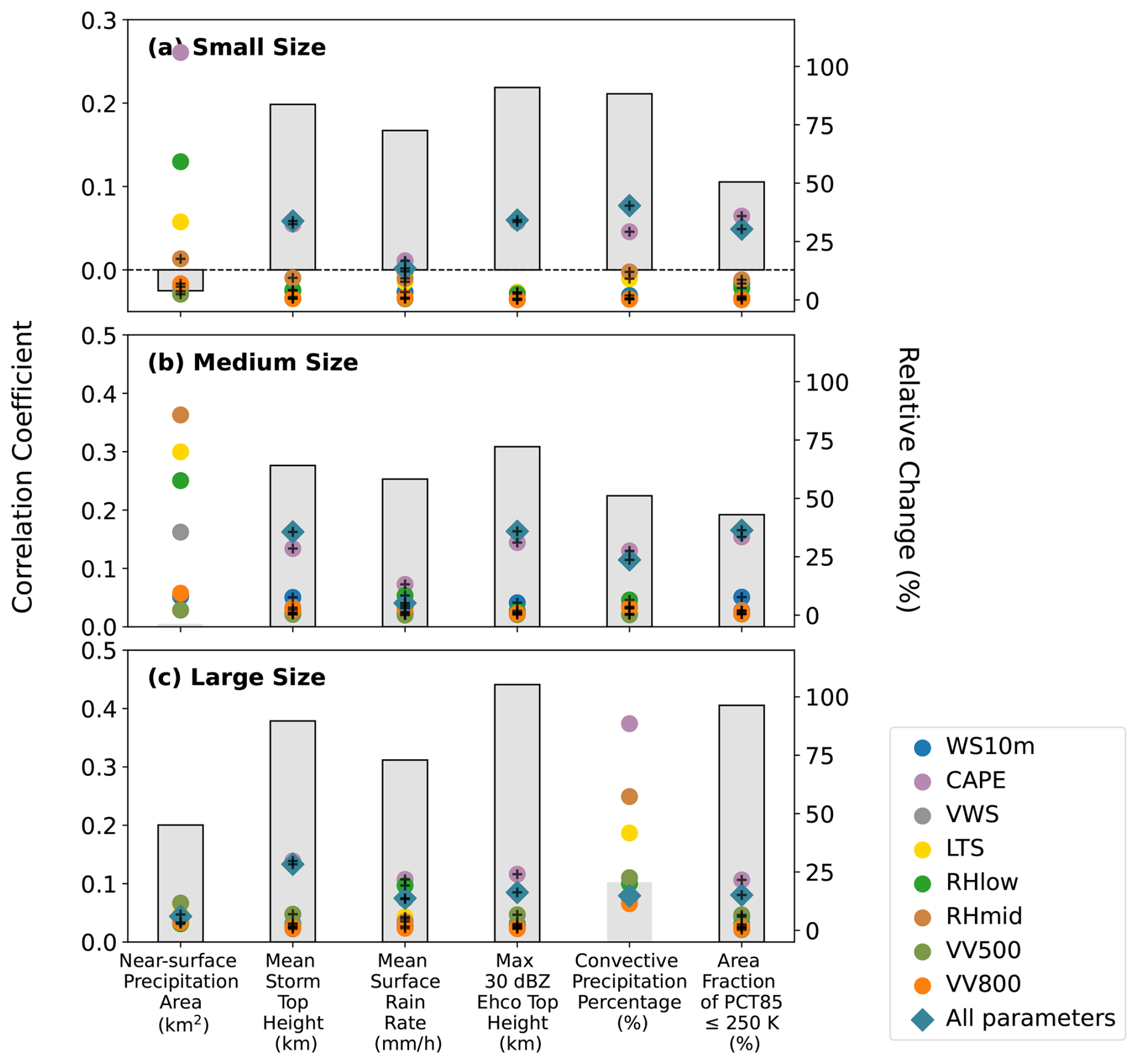 Figure 7Total correlations between AOD and PS properties (bars, left y-axis), and the relative changes in partial correlations with the effects of 8 meteorological parameters eliminated individually (colored circular markers) and totally (diamond-shaped markers), compared with total correlations (right y-axis) for (a) small-sized, (b) medium-sized and (c) large-sized PSs. The black border around grey data bar and the black cross on the marker indicate that the total correlation and the partial correlation are statistically significant at the 95 % confidence level, individually.