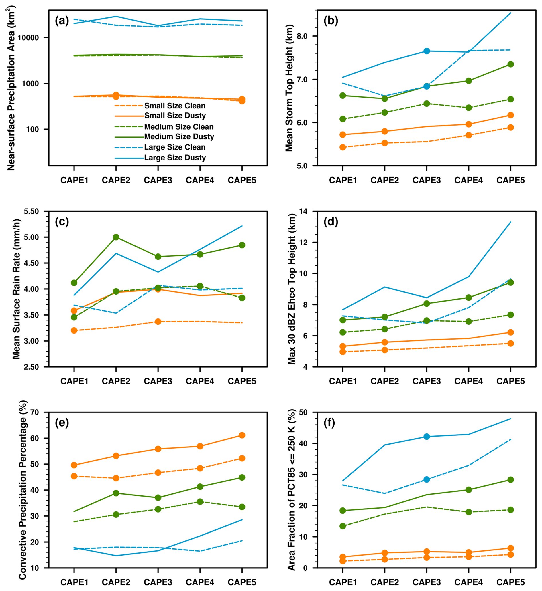 Figure 8Variations in PS properties, including (a) near-surface precipitation area (km2), (b) mean storm top height (km), (c) mean surface rain rate (mm h−1), (d) maximum 30 dBZ echo top height (km), (e) convective precipitation percentage (%) and (f) area fraction of PCT85 ≤ 250 K (%), as a function of CAPE, for different sizes of PSs under clean and dusty conditions. The orange, green, and blue lines represent small-, medium- and large-sized PSs, respectively. The dashed and solid lines represent clean and dusty conditions, respectively. The circular marker indicates that the difference between clean and dusty conditions is statistically significant at the 95 % confidence level using a Student's t-test.