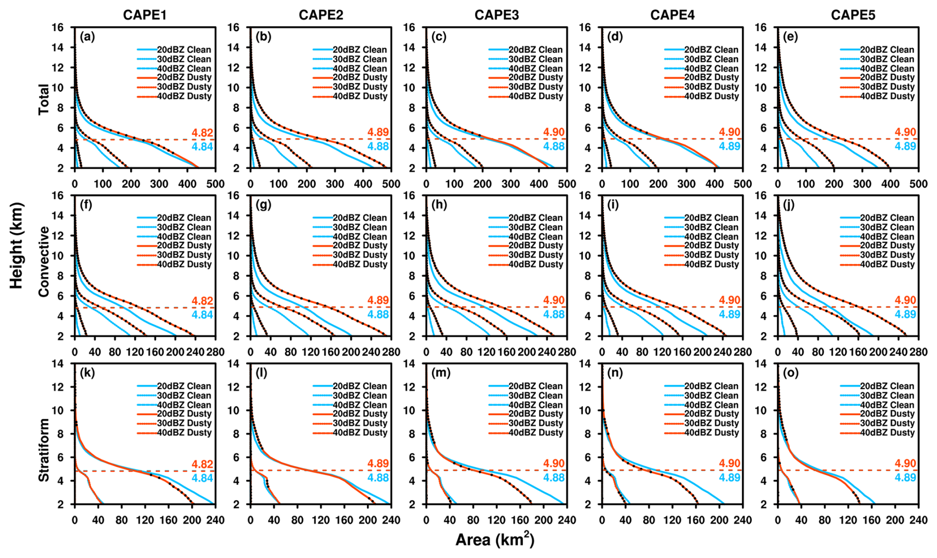 Figure 9The mean vertical profiles of 20, 30 and 40 dBZ areas for total (upper row), convective (middle row) and stratiform (bottom row) precipitation of small-sized PSs with different CAPE values under clean and dusty conditions. The black dot on the red line indicates that the difference between clean and dusty conditions is statistically significant at the 95 % confidence level using a Student's t-test. The horizontal dashed lines show the freezing level with values labeled.
