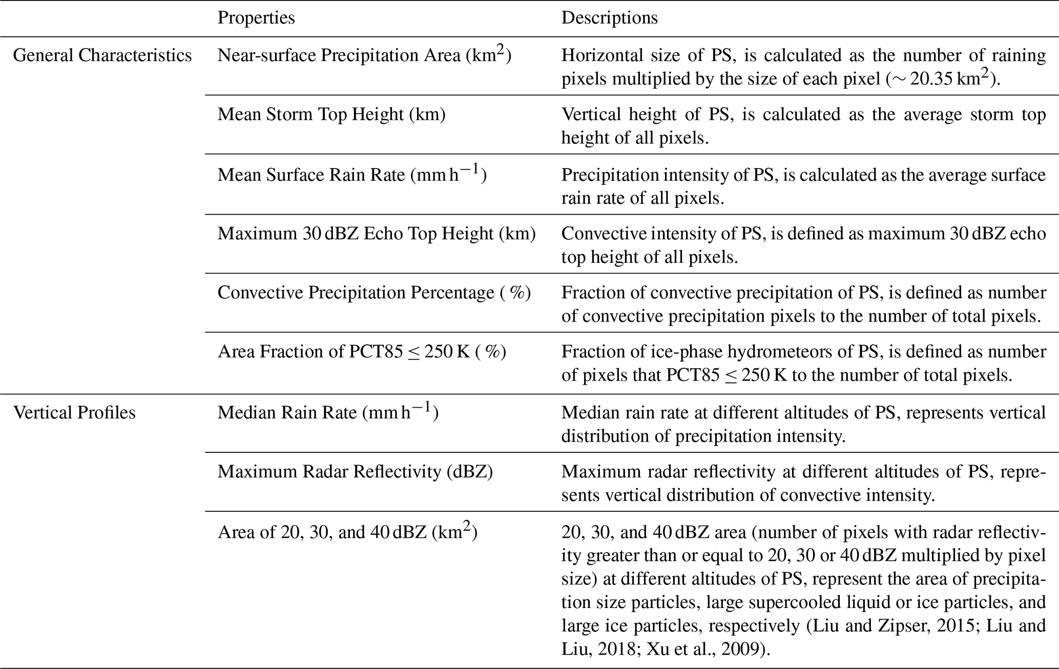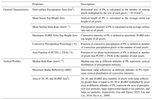 As shown in Table 1, the selected parameters describing PS properties of 3-D structure and intensity are divided into two categories: general characteristics and vertical profiles. The former includes the near-surface precipitation area, mean storm top height, mean surface rain rate, maximum 30 dBZ echo top height, convective precipitation percentage and area fraction of PCT85 ≤ 250 K. In these characteristics, maximum 30 dBZ echo top height represents the maximum altitude that large hydrometeors can reach, which is often used as an indicator of convective intensity because intense updrafts are required to lift large hydrometeors to higher altitudes (Liu and Zipser, 2013, 2015). In addition, the area fraction of PCT85 ≤ 250 K represents the fraction of ice-phase hydrometeors in the PS (Toracinta et al., 2002). The vertical characteristics of PS are composed of variables such as the median rain rate, maximum radar reflectivity and precipitation area of 20, 30 and 40 dBZ. It should be mentioned that the mean rain rate is typically used to represent precipitation intensity when performing statistical analysis on isolated raining pixels. Within a complete PS, however, the distribution of precipitation rates tends to follow a gamma distribution (Martinez-Villalobos and Neelin, 2019; Fan et al., 2024), with a majority of weak precipitation largely determining the average value. Therefore, the median rain rate is used here to indicate the precipitation intensity of the entire PS.