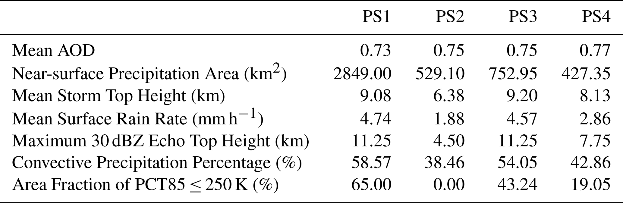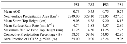 As an example, Fig. 1 shows the spatial distributions of near-surface rain rate and AOD for the 4 PSs that occurred over Atlantic Ocean on 27 February 2008, and their general characteristics are given in Table 2. It can be seen that different PSs are highly variable in terms of the horizontal scale, as well as other properties and dust conditions. For example, PS2 and PS4 have similar horizontal sizes but exhibit noticeable differences in storm top heights and surface rain rates, implying differences in thermodynamic and dynamic conditions, or possibly aerosol effects. In particular, the higher maximum 30 dBZ echo top height and greater convective precipitation percentage in PS4 demonstrate stronger convective intensity, with a greater number of ice-phase particles. Moreover, it is interesting that PS1 and PS3 have different near-surface precipitation areas but similar other properties, such as maximum 30 dBZ echo top height, surface rain rate and convective precipitation percentage, which may be due to their locations in adjacent regions, resulting in relatively consistent background fields and dust aerosol concentrations.