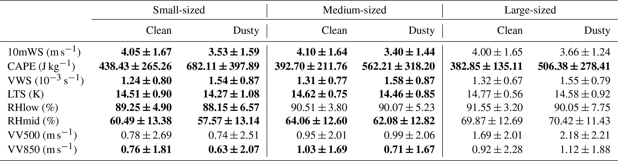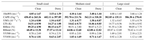 Table 4 presents the statistical results of several meteorological parameters for clean and dusty PSs of different sizes, respectively. It is remarkable that dust-affected PSs exhibit stronger thermodynamic conditions (significantly higher CAPE and lower LTS), which are more favorable for the development of PSs. Also, the VWS increases significantly, similar to previous studies (Dunion and Velden, 2004). This may be due to the fact that PSs with dust aerosol loading are mainly located in the SAL, where the midlevel African easterly jet centered near 700 hPa can greatly increase the low-level VWS. The intrusion of dry and warm air here (Dong et al., 2018) also causes lower RHmid in these PSs. On the other hand, the meteorological conditions favorable for large-sized PSs, such as strong atmospheric instability and persistent large-scale moisture transport and convergence (Zhou et al., 2013), are always similar regardless of dust concentration. In contrast, the differences in meteorological conditions between pristine and dusty conditions are more significant for small- and medium-sized PSs.