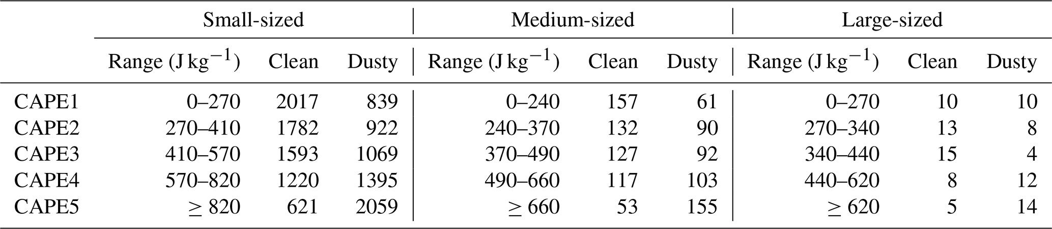 On the other hand, the differences in the zonal distribution of PSs between dust-free and dust-laden scenarios (Fig. 2) may also be accompanied by variations in meteorological fields, due to the strong land-sea thermal contrast. The high surface temperatures near land and abundant moisture inflow from the ocean increase atmospheric instability in coastal areas, resulting in higher CAPE values (Roy Bhowmik et al., 2008; Alappattu and Kunhikrishnan, 2009). In this regard, Fig. S5a shows that the multi-year average CAPE is indeed higher in areas closer to the coastline. Also, it is interesting that the mean CAPE over the ocean for PSs with heavy dust is higher than that under pristine conditions (Fig. S5d). Therefore, the influence of the background field should not be ignored when studying dust effects on PSs, although in above analysis we have attempted to constrain it through classifying PSs by size.