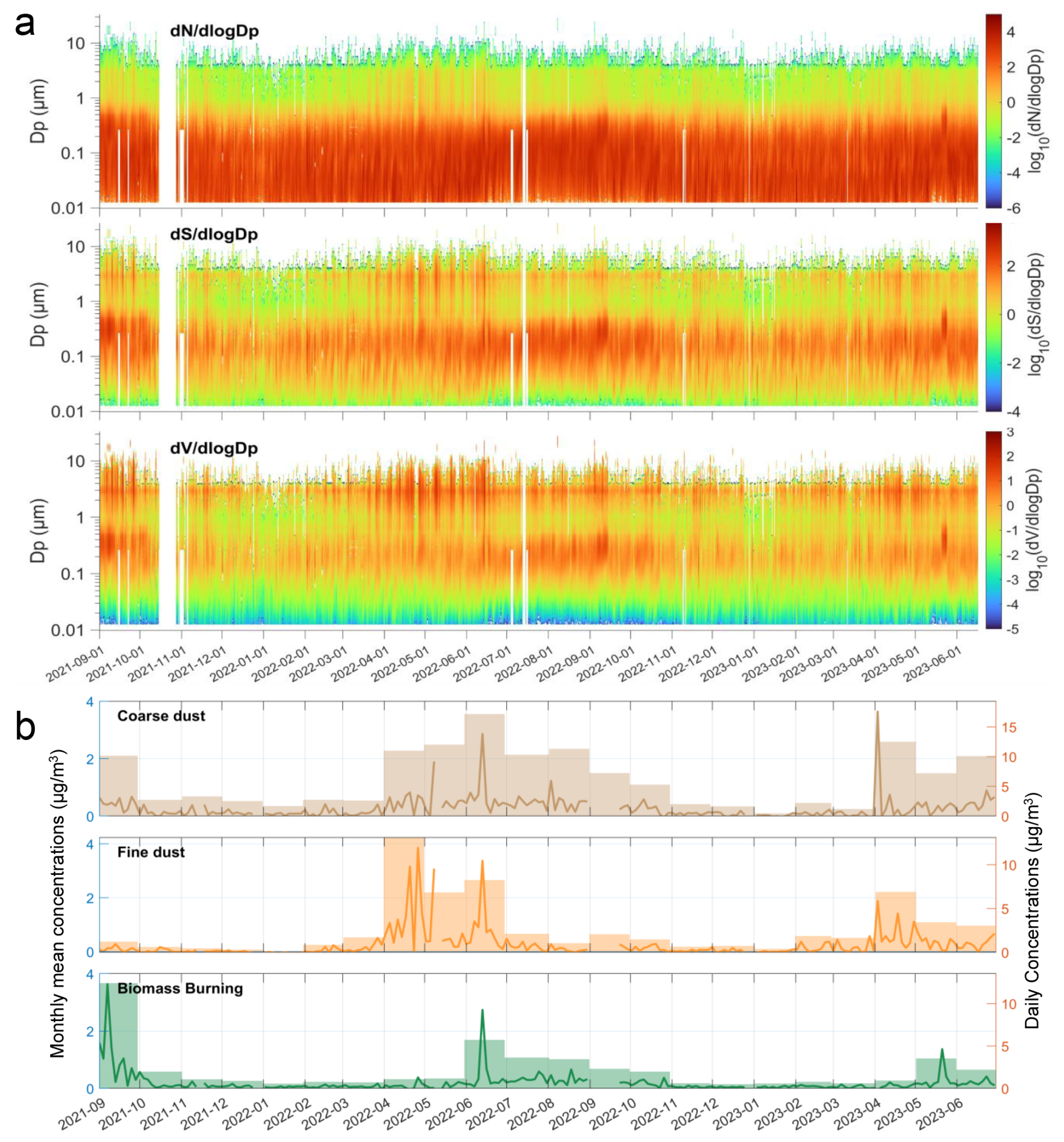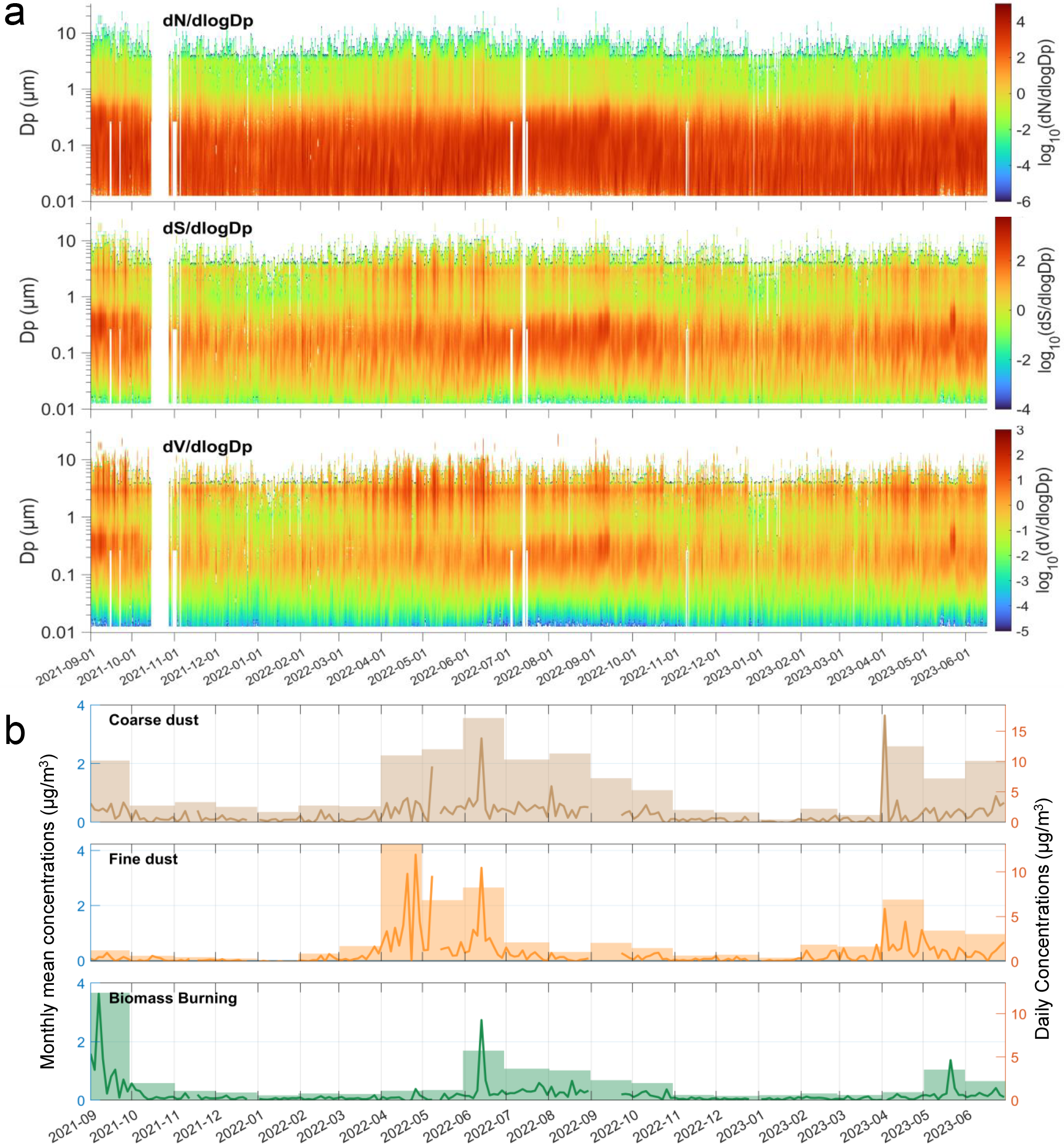 Figure 2(a) Number size distribution (dN/dlogDp, scm−3), surface area size distribution (dS/dlogDp, µm2 scm−3), and volume size distribution (dV/dlogDp, µm3 scm−3), derived from merged size distribution assuming spherical particles during the SAIL campaign. (b) Time series of aerosol mass concentrations (µg m−3) of coarse dust, fine dust, and biomass burning. Lines and bars represent daily and monthly mean concentrations, respectively.