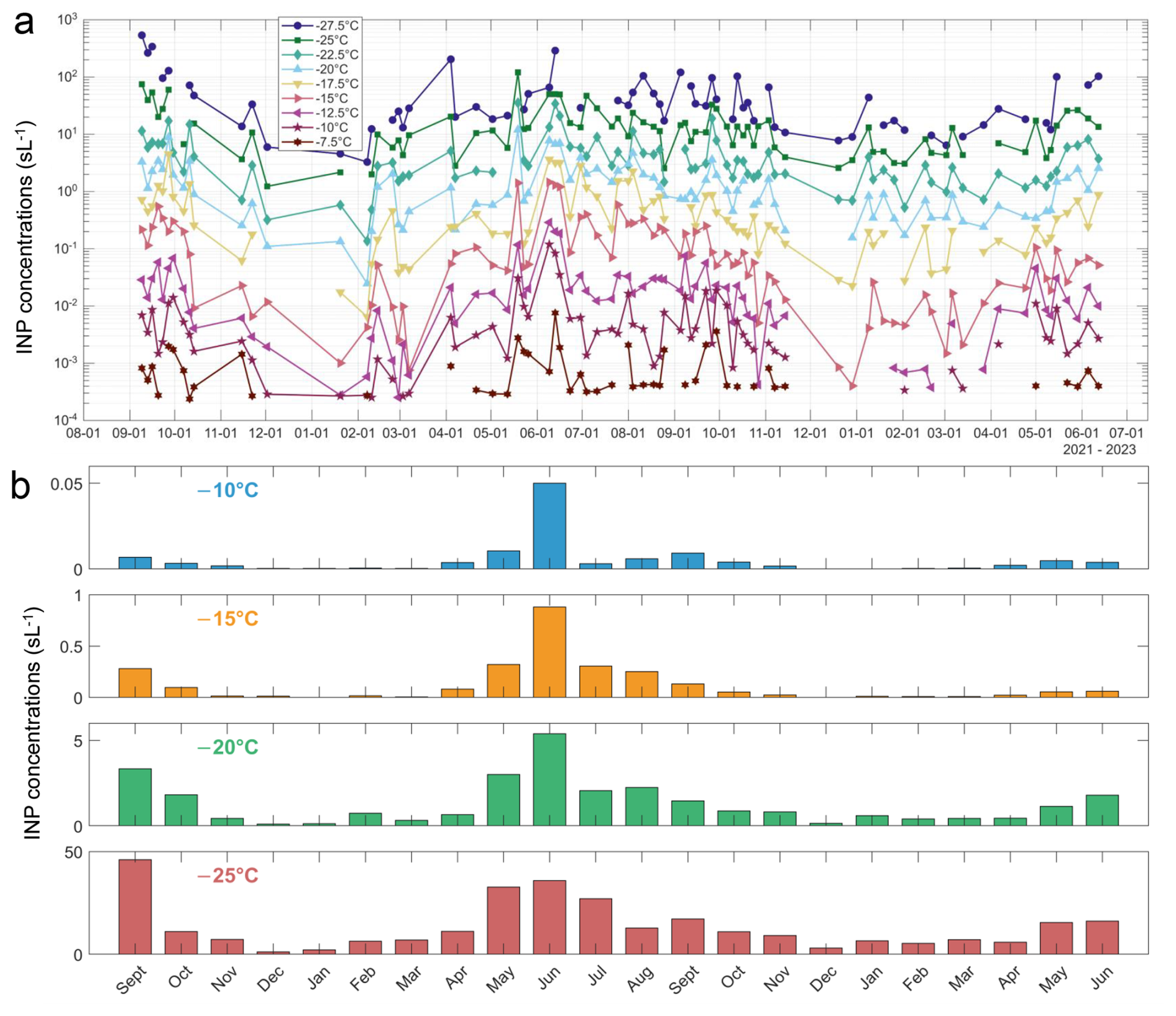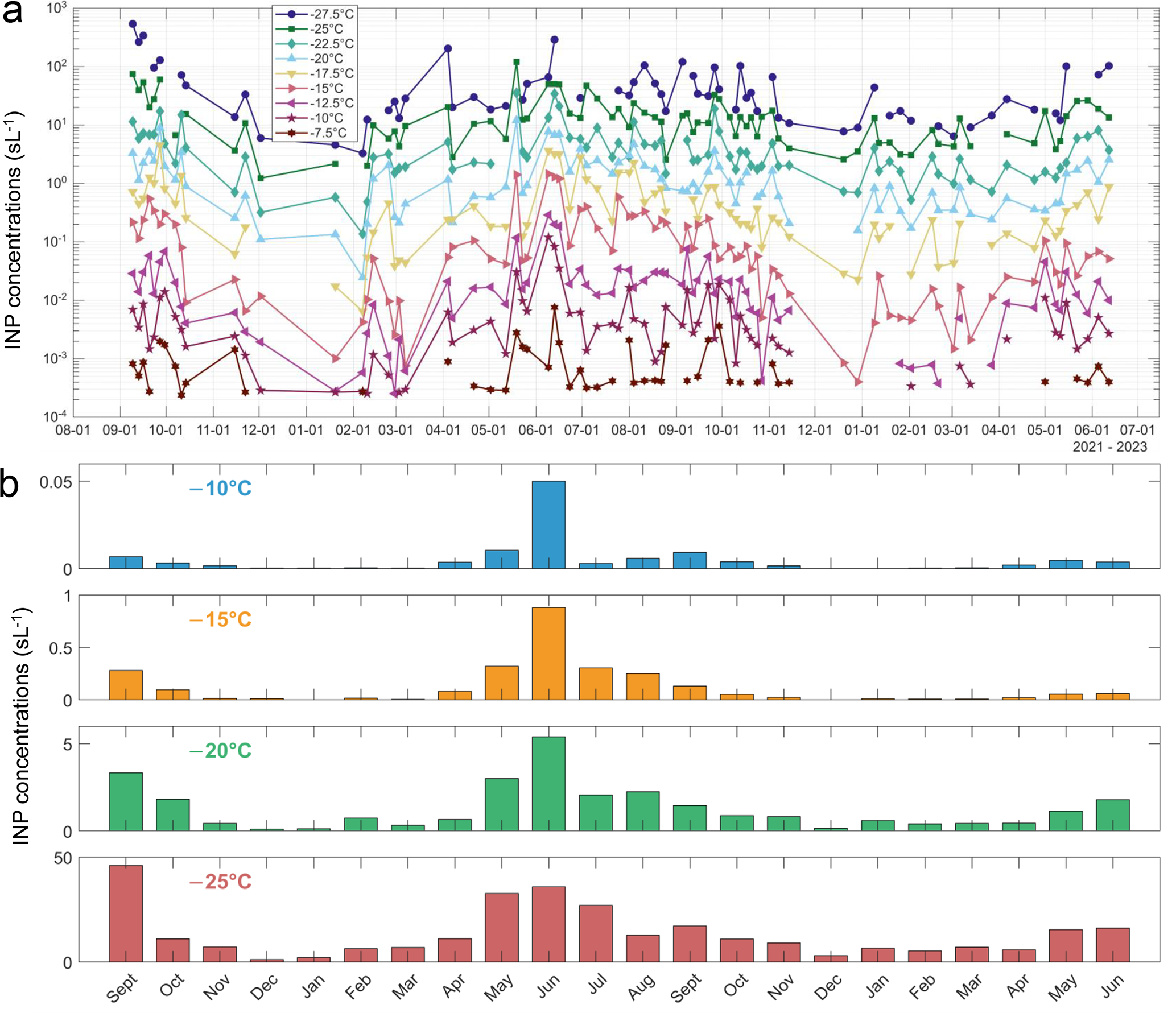 Figure 3Measured INP concentrations (sL−1) during the SAIL campaign (September 2021–June 2023), excluding samples obtained during cloud seeding and snowmaking activities. (a) INP concentrations at temperatures from −7.5 to −27.5 °C in 2.5 °C intervals. (b) Monthly mean INP concentrations at temperatures of −10, −15, −20, and −25 °C.