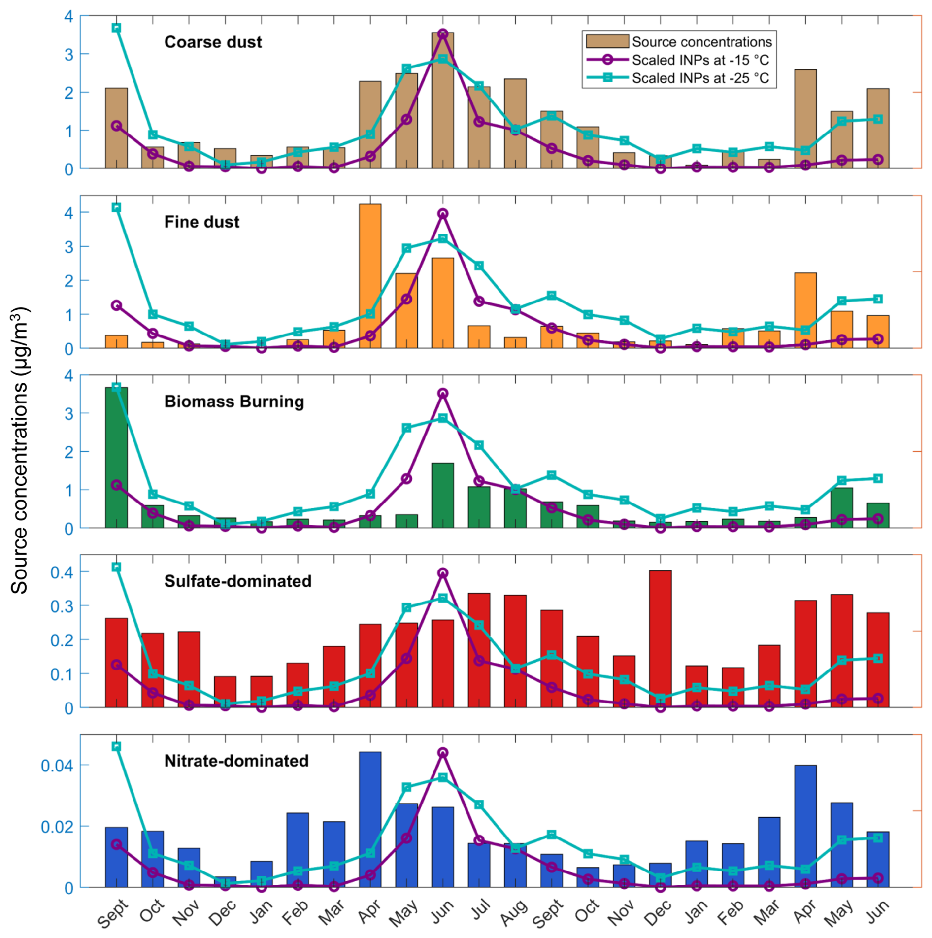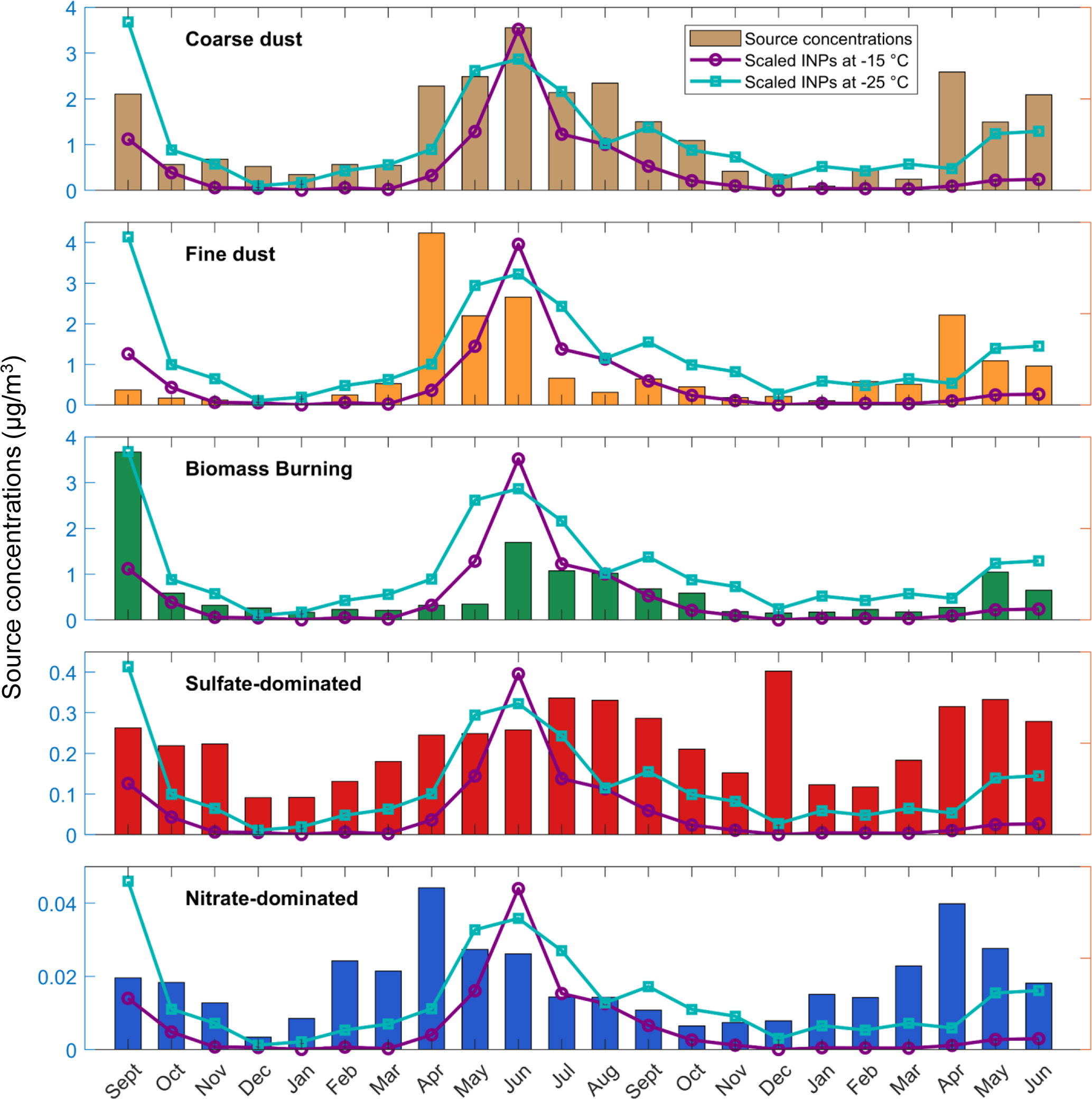 Figure 4Monthly mean INP concentrations (lines, arbitrary scaling) at −15 and −25 °C and monthly mean aerosol mass concentrations (bars) from coarse dust, fine dust, biomass burning, sulfate-dominated, and nitrate-dominated sources.