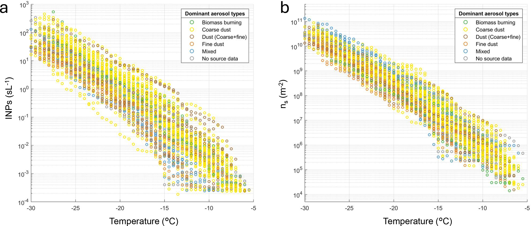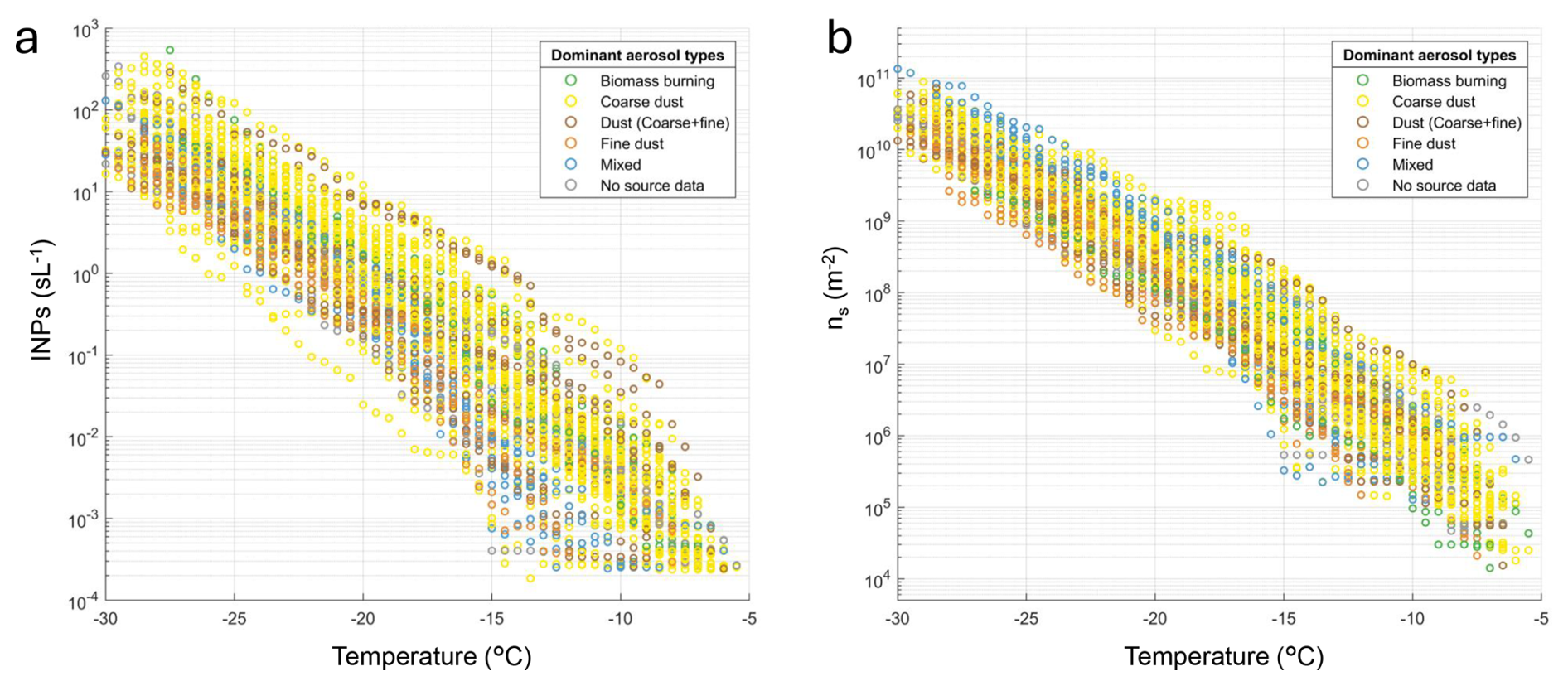 The IN active surface site density (ns) temperature spectra, a measure of INPs per aerosol surface area, are shown in Fig. 5b for all samples, categorized by dominant aerosol type. Compared to INP concentrations, the ns values were less variable at a given temperature, with most samples within one order of magnitude of each other, whereas INP concentrations spanned nearly two orders of magnitude, suggesting that at least some of the variability in INP concentrations can be explained by differences in particle size distributions and concentrations.