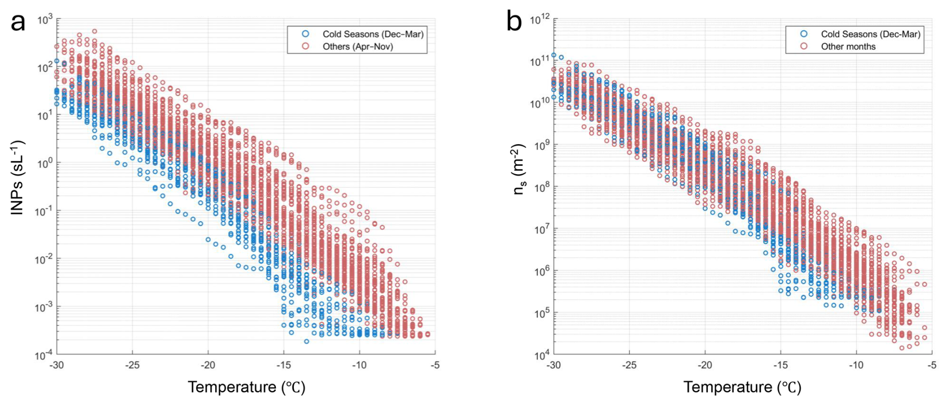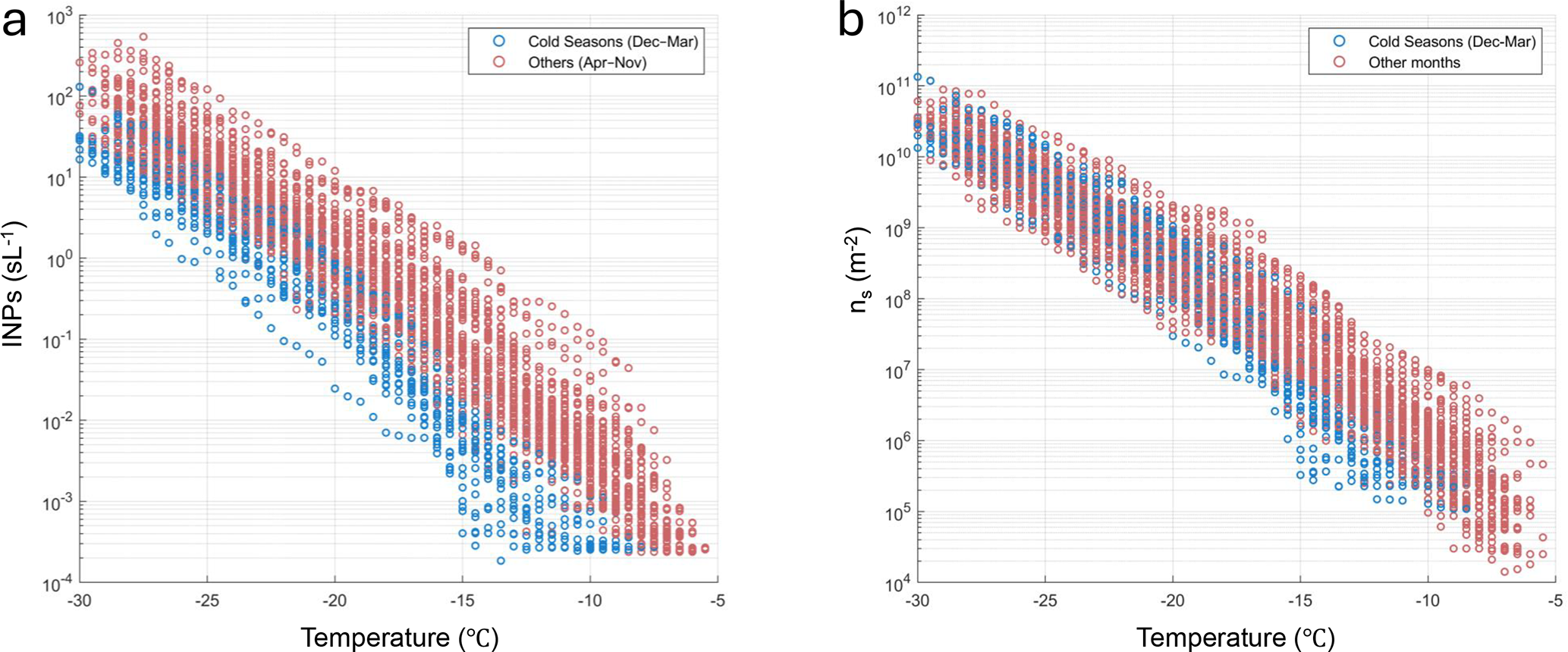 Figure 6(a) INP temperature spectra and (b) IN active surface site density (ns) categorized by sampling date as cold seasons (December–March) and other seasons (April–November). ns was calculated based on the surface area of particles larger than 500 nm.