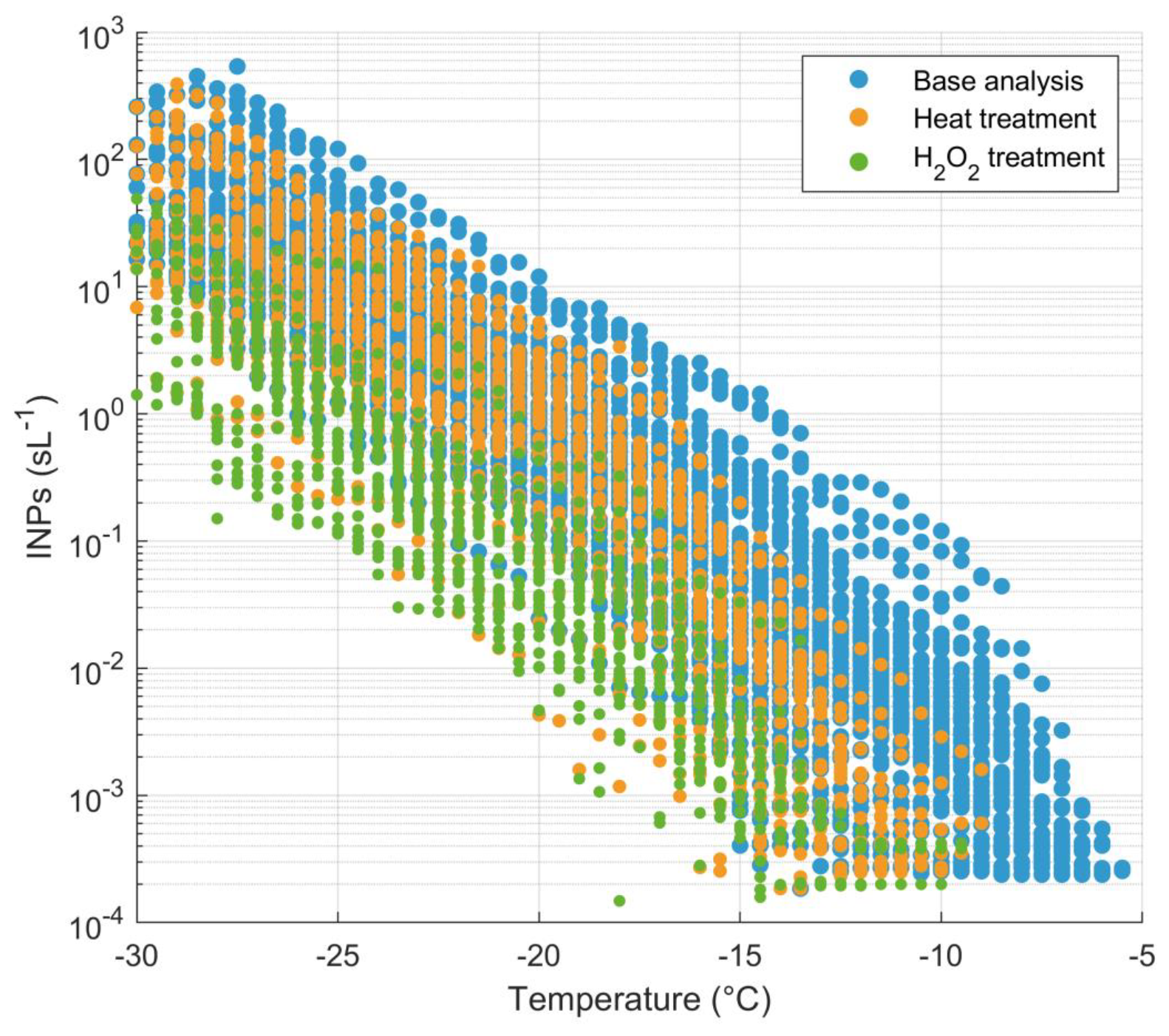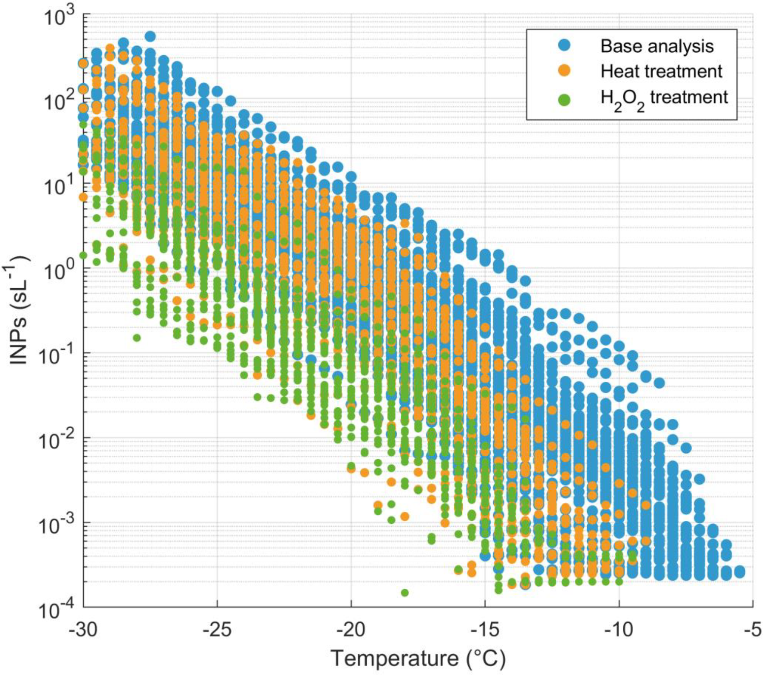 Figure 7Comparison of INP temperature spectra from base (untreated), heat-treated, and H2O2-treated analyses.