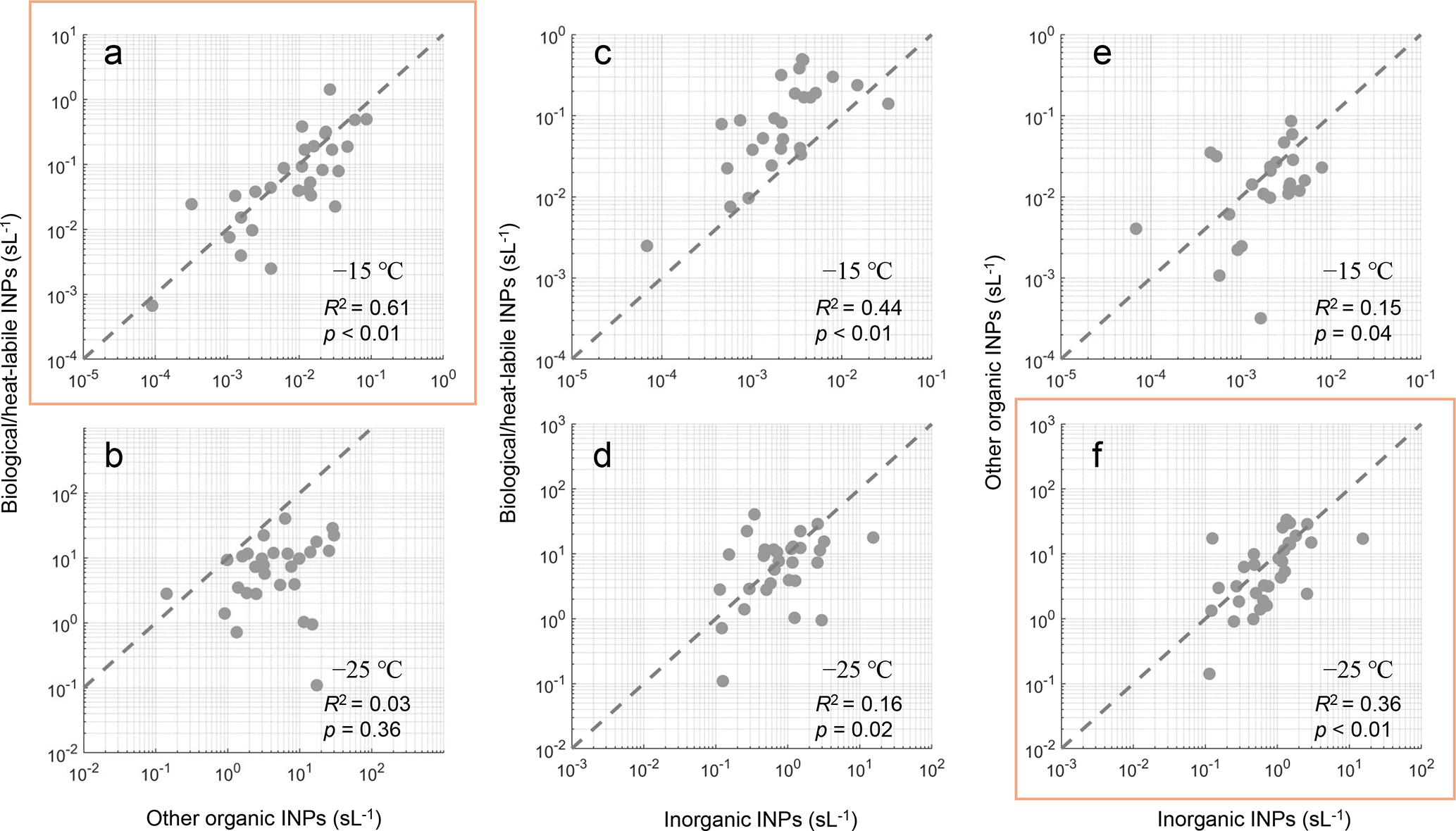 Figure 8Correlations between concentrations of (a, b) biological/heat-labile INPs and other organic INPs, (c, d) biological/heat-labile INPs and inorganic INPs, and (e, f) other organic INPs and inorganic INPs, active at either −15 °C (upper row) or −25 °C (lower row). Dashed lines indicate a 10:1 relationship for reference, and the orange rectangles highlight the strongest correlations at each temperature.