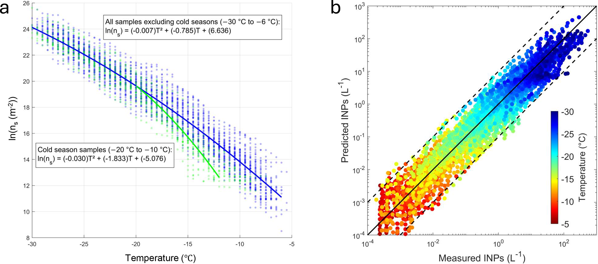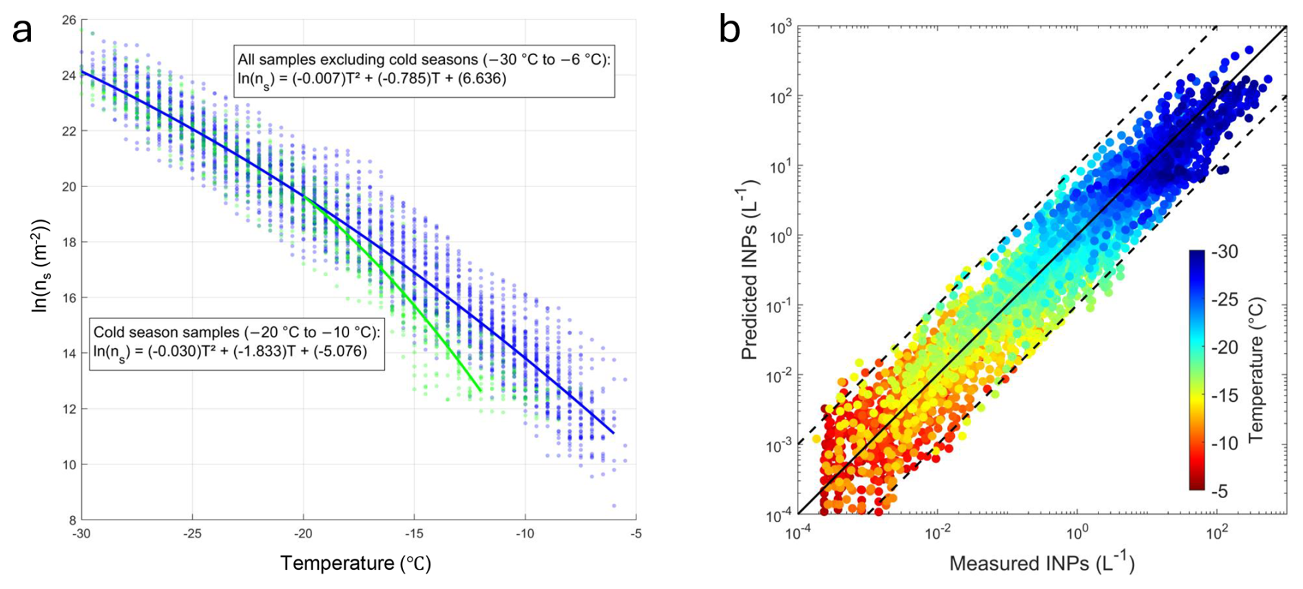 Figure 9(a) All cold season (December–March) and other seasons (April–November) INP data, expressed as IN active surface site density ns (based on the surface area of particles larger than 500 nm), with parameterization fits. All samples, excluding those from cold seasons, were used to develop the parameterization equation for temperatures from −30 to −6 °C. A separate equation was developed for samples from cold seasons at temperatures from −20 to −10 °C. (b) Comparison between predicted INP concentrations based on the parameterization equations and measured surface area concentrations, and measured INP concentrations.