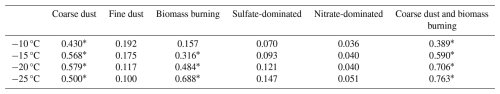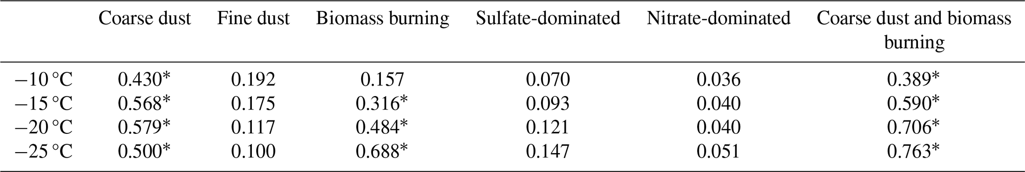 Table 1Pearson correlation coefficients (R2) between monthly means of INP concentrations and source factor concentrations.