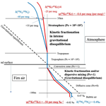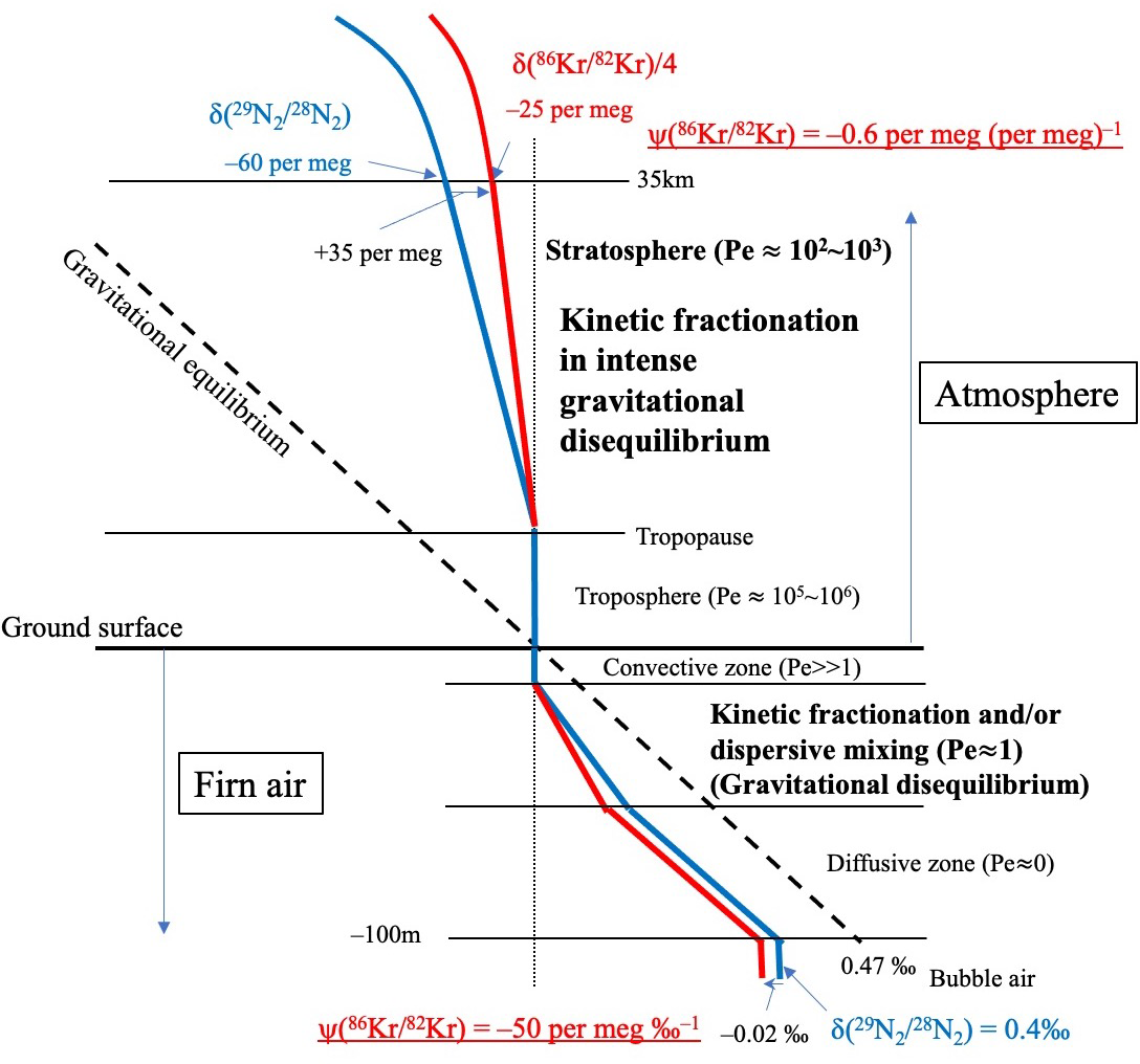 Figure 6Schematic representation of vertical profiles of δ(X/Y) and the effects of kinetic fractionations in a firn and the stratosphere. δ(29N2/28N2), δ(86Kr/82Kr)/4, and its excess value, ψ(86Kr/82Kr), are shown as an example of the heavy nobles gases. Note that the scales of the vertical and horizontal axes differ between the firn and atmosphere.