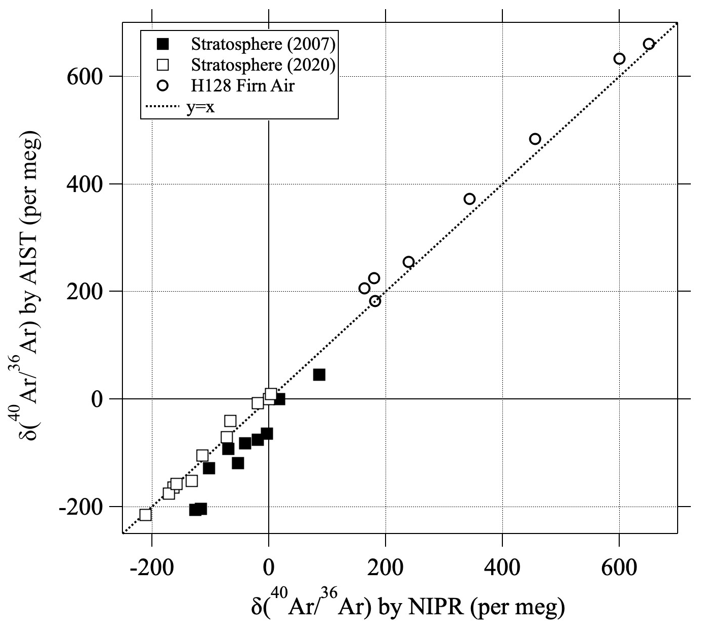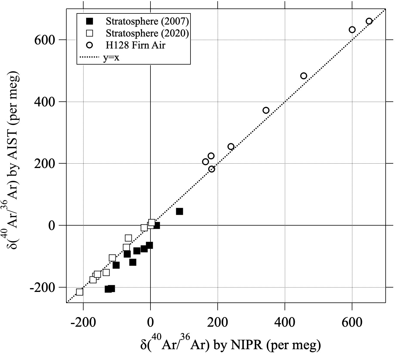 Figure 1Comparisons of δ(40Ar/36Ar) values measured at the National Institute of Advanced Industrial Science and Technology (AIST) and National Institute of Polar Research (NIPR) for the stratospheric air samples (closed and open squares). The results measured for H128 firn air (Oyabu et al., 2025) are also shown by open circles. The linear function y=x is shown by the dotted line.